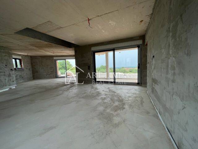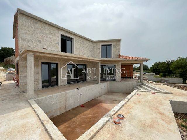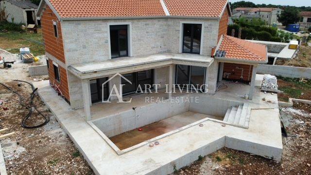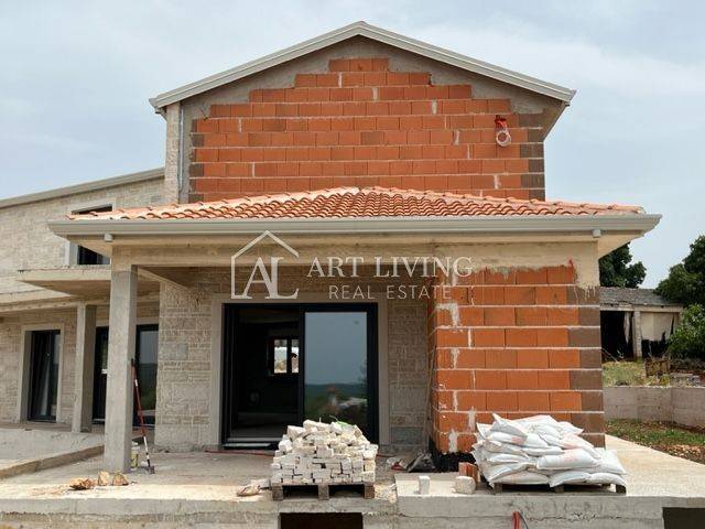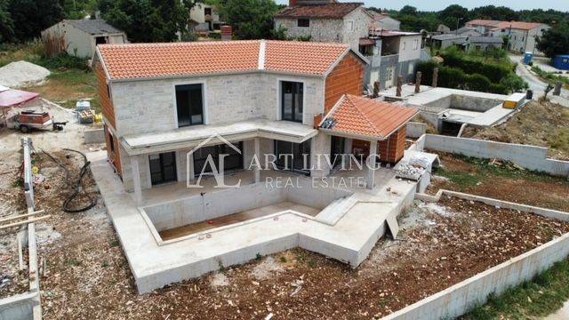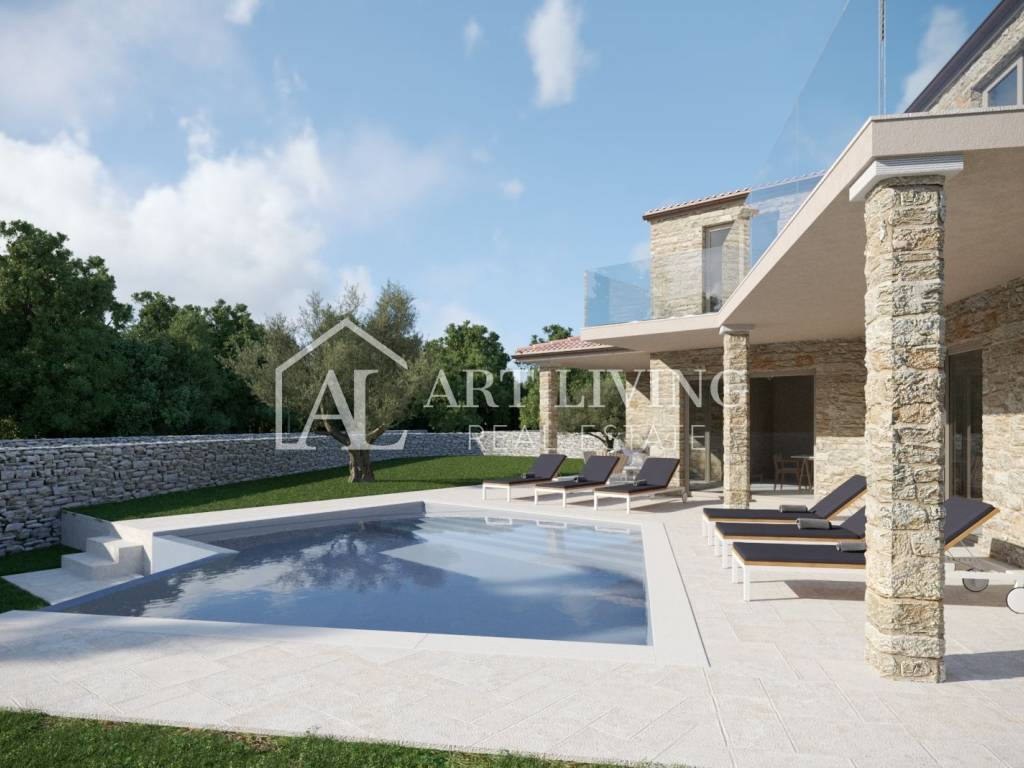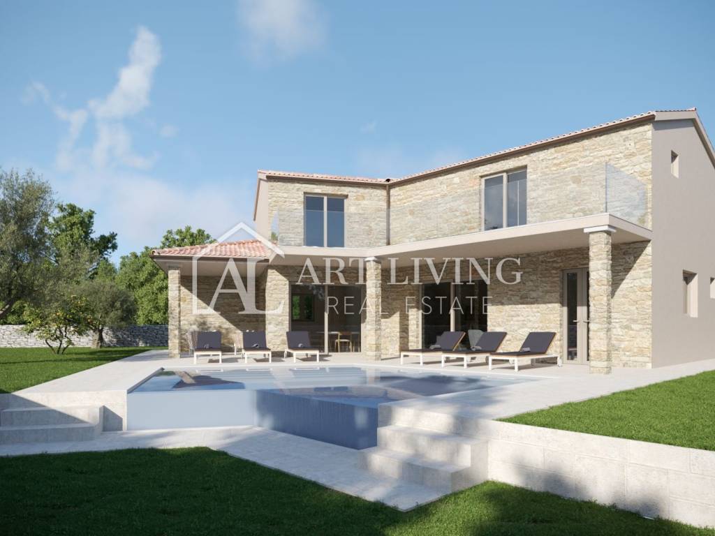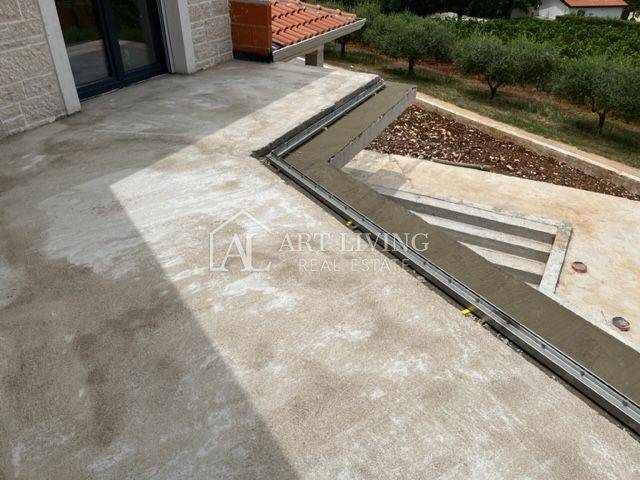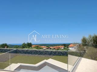 A beautiful Villa in the Istrian style of modern architecture with a swimming pool and an open view of the sea and the landscape is for sale. The villa is located in a quiet location and is surrounded by nature and greenery. It is 8 km from the sea and the city of Poreč.