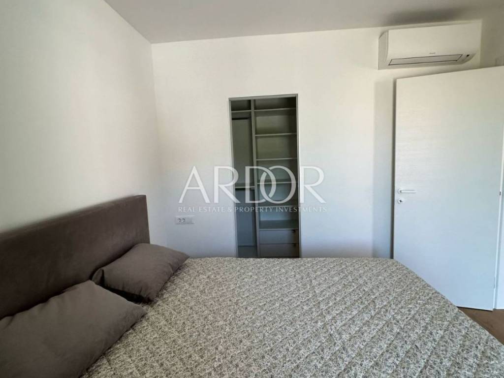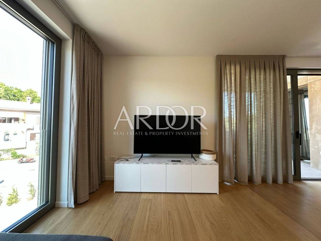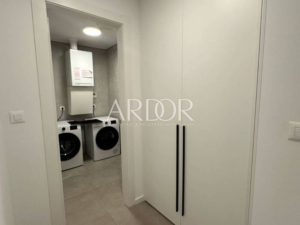A smart and spacious two-bedroom apartment with a living room, covering 72 m², is available for rent in a quiet part of Zamet. The apartment is filled with natural light, and the layout includes two bedrooms, a modern bathroom, a laundry room with a washer and dryer, a spacious living room with a kitchen, and a storage room. It is fully equipped for comfortable living, with central gas heating throughout the apartment and air conditioning units.