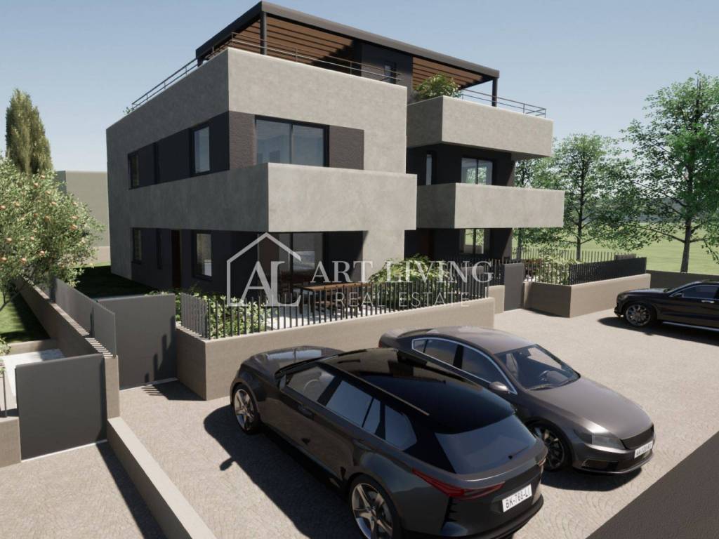 In an extremely attractive location, only 2 km from the center of Poreč and 1 km from the sea and landscaped beaches, this luxury apartment is for sale on the ground floor of a small modern residential building with four residential units.