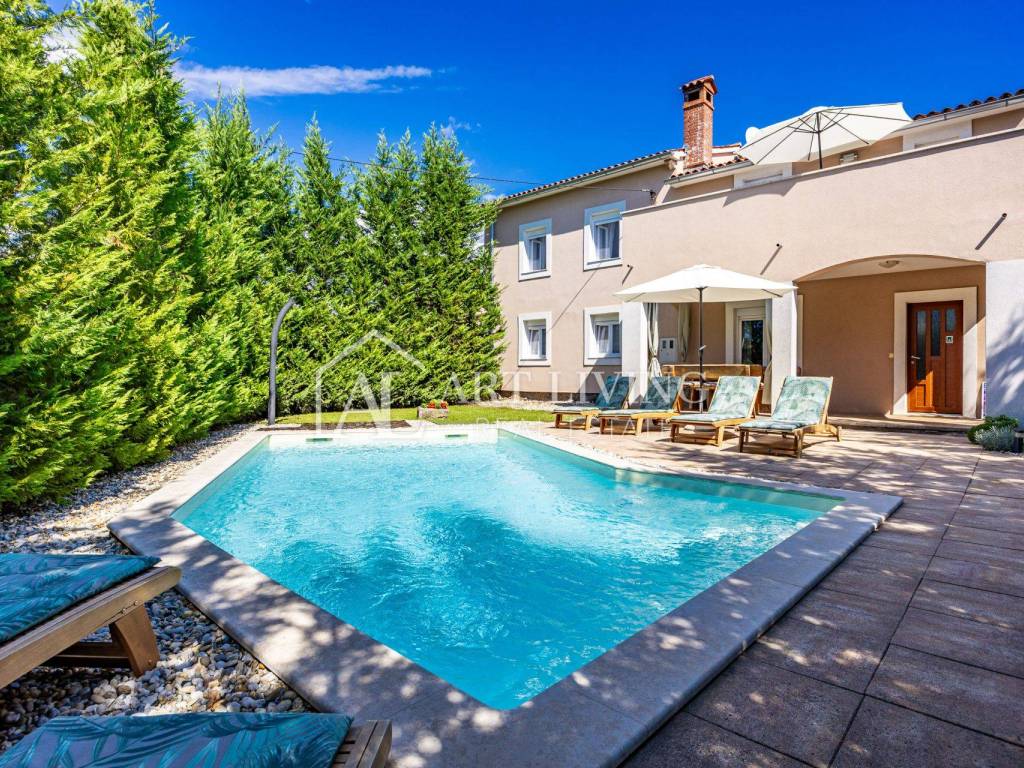 A beautiful house with a swimming pool, in the Istrian style, is for sale, located in a quiet location and surrounded by nature and greenery. It is 6 km from Svetvinčent, 11 km from Vodnjan and 19 km from the sea.