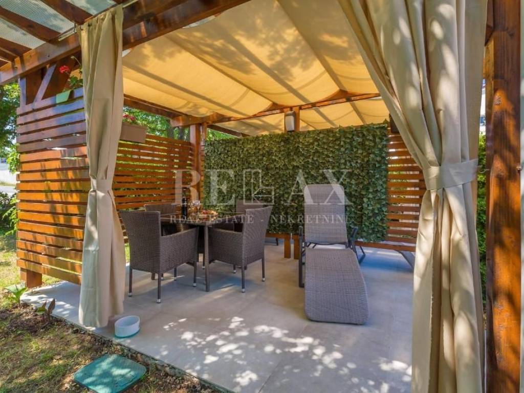 In addition to the living space, the apartment comes with a spacious terrace of 80 m², ideal for outdoor living, socializing, and relaxing during the summer months. The terrace connects to a beautifully landscaped garden with a wooden gazebo and a barbecue, further enhancing the living experience. The northern orientation offers a view of the peaceful surroundings, while the presence of greenery ensures a sense of tranquility and privacy.
