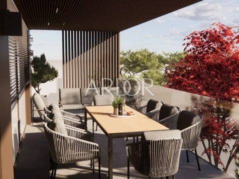This modern apartment is on the first floor and has a living area of 134.87 m². It comprises a living room combined with kitchen and dining area, three bedrooms with en-suite bathrooms, a storage room, and a guest WC. The apartment features two covered terraces and a loggia.