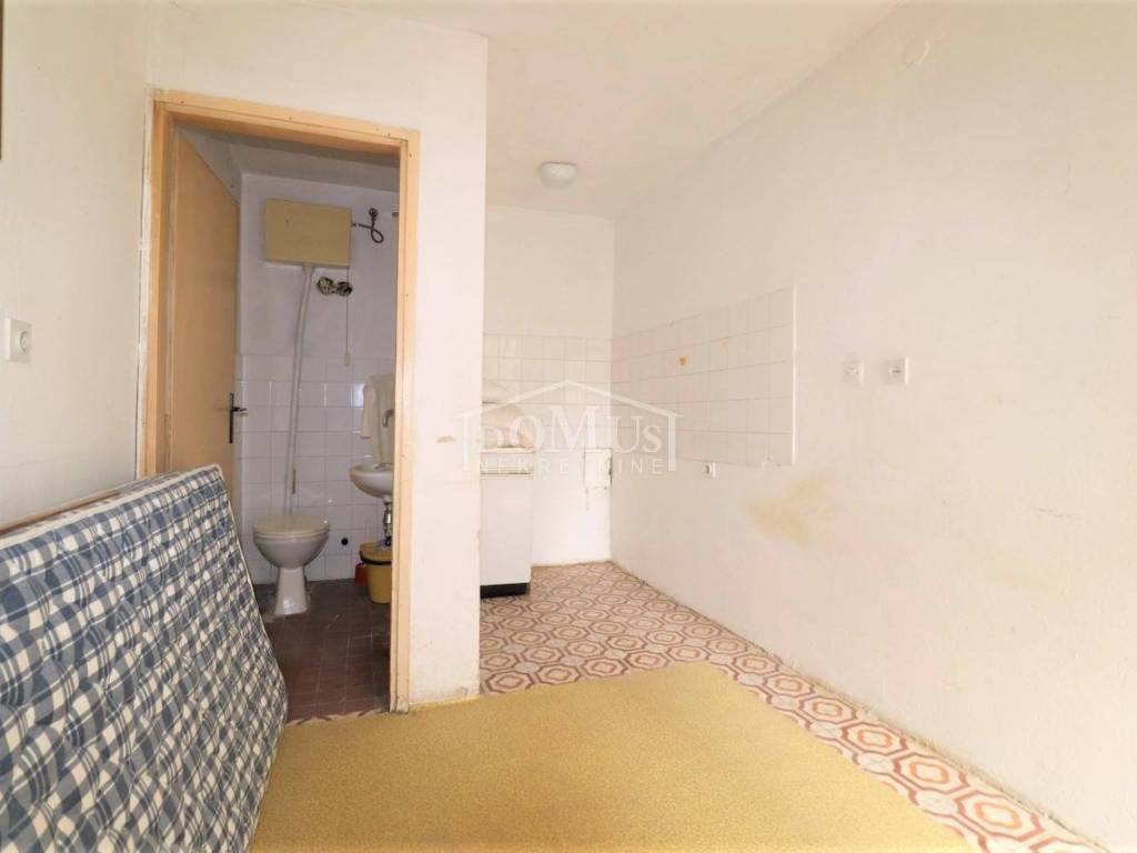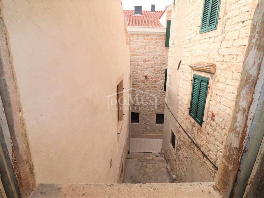 Attractive location, 3rd row to the sea (40m), only 100m from the Cathedral, in the old core of the Dolac district, there is a stone house, a two-story building on 4 floors, ground floor + 1st floor + 2nd floor + attic, with a total of 103m2 residential areas. On the ground floor of 18m2 there is a tavern area and internal stairs that lead to the upper floor. On the 1st floor of 52.50m2, there is one room, and the second part is a semi-detached house with two rooms, and internal stairs to the 2nd floor. There is a room on the 2nd floor of 23m2, and a landing for the attic of 10m2 where the kitchen and toilet are located. The house is not habitable and needs complete adaptation, and it has a wooden mezzanine construction. The house is well lit and has windows on two sides. The house has a complete infrastructure (electricity, water, sewerage). The house has no access by car, and the parking lot is 35m away on a public surface. The sea is 40 m away, and the city beach is 800 m away.