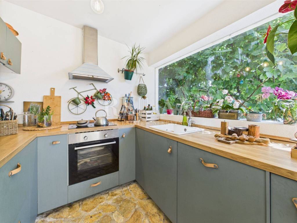 From the living area, there is access to a spacious stone terrace of 37.16 m², surrounded by greenery and flowers, perfect for relaxation or outdoor gatherings. Additionally, the apartment includes a 10 m² garden and a 2.70 m² storage room within the building, providing practical storage space.