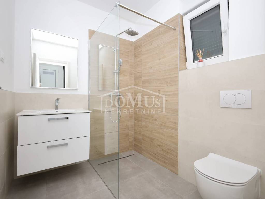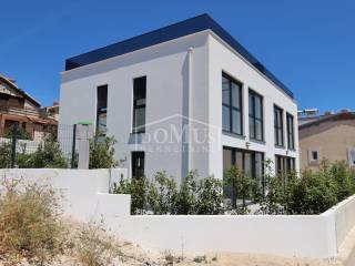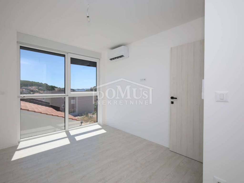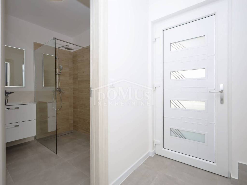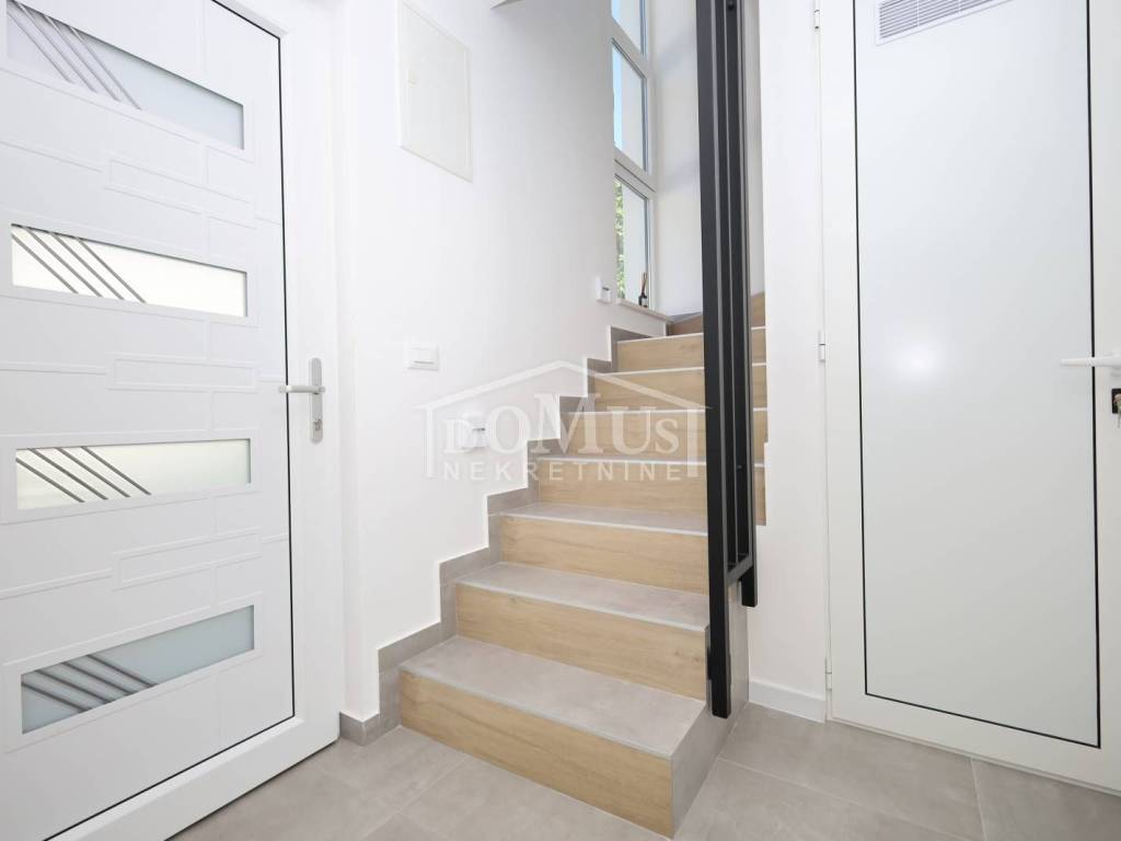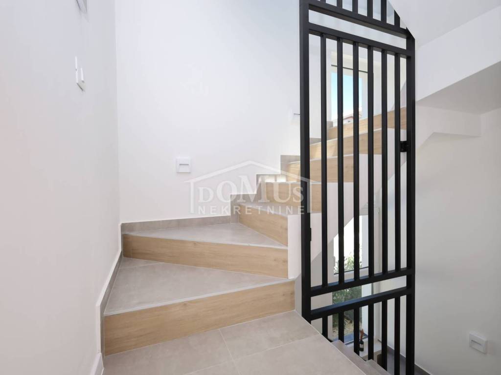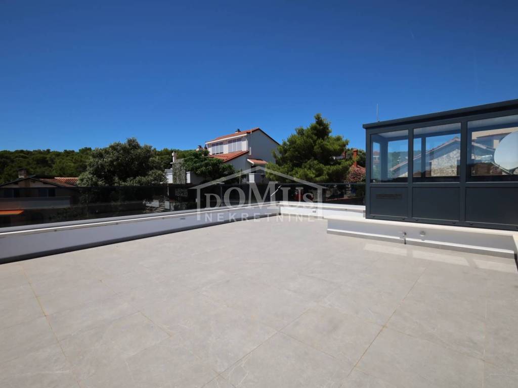 Family house in Tisno, 480 m from the pebble beach. The house is a semi-detached house on three floors: ground floor, 1st floor and 2nd floor / roof terrace with a total of 96.14 m² of usable area and 30 m² of garden with a large terrace of 15 m². The ground floor of the house consists of a hallway, a bathroom, a storage room, a large living room with a kitchen and a dining room with access to a terrace with an adjoining yard. On the first floor of the house there are three bedrooms, a bathroom and a hallway. On the 2nd floor of the house there is a large roof terrace of 24.50 m² with a view of the sea. The house is completely finished and ready for immediate occupancy. It is equipped with burglar-proof doors, ALU carpentry with electrically controlled blinds, underfloor heating in the bathrooms and air conditioning in every room. The surroundings are decorated with Mediterranean plants, and the parking area is paved. The house is 300 m from the sea and 1000 m from the town center.