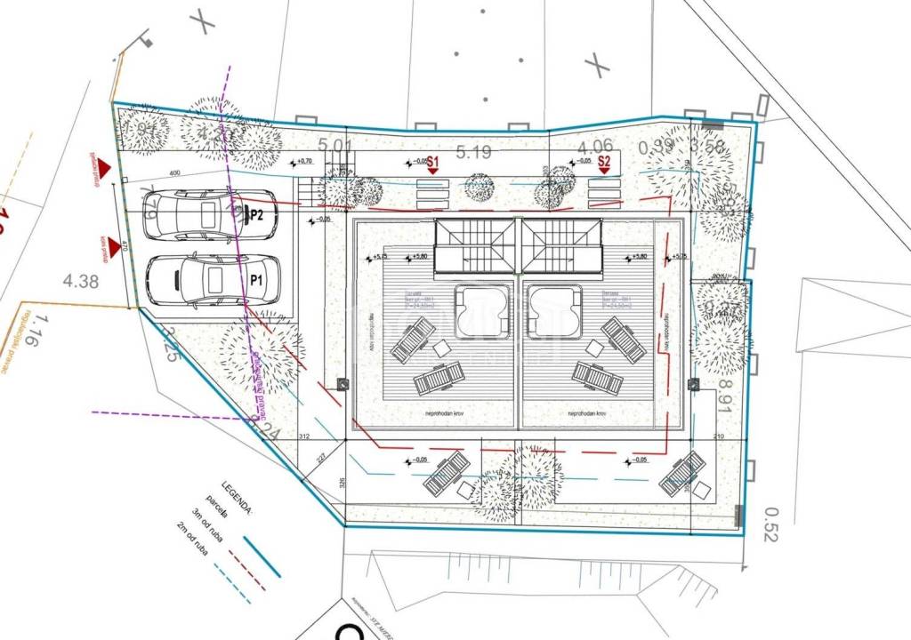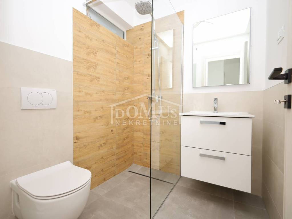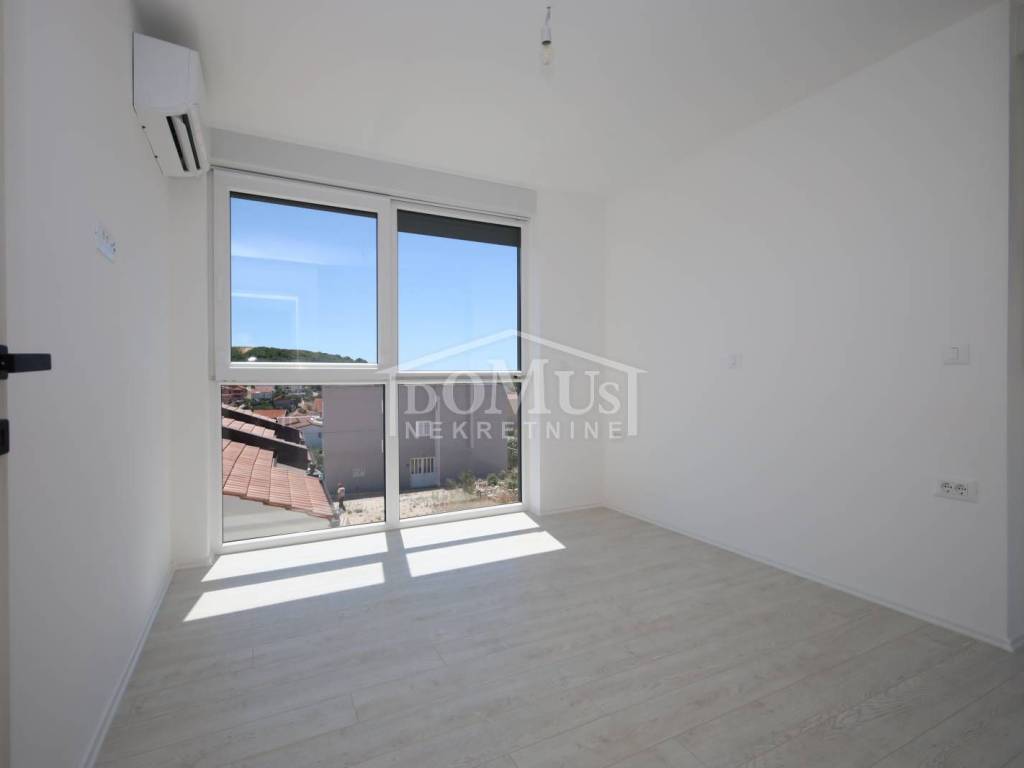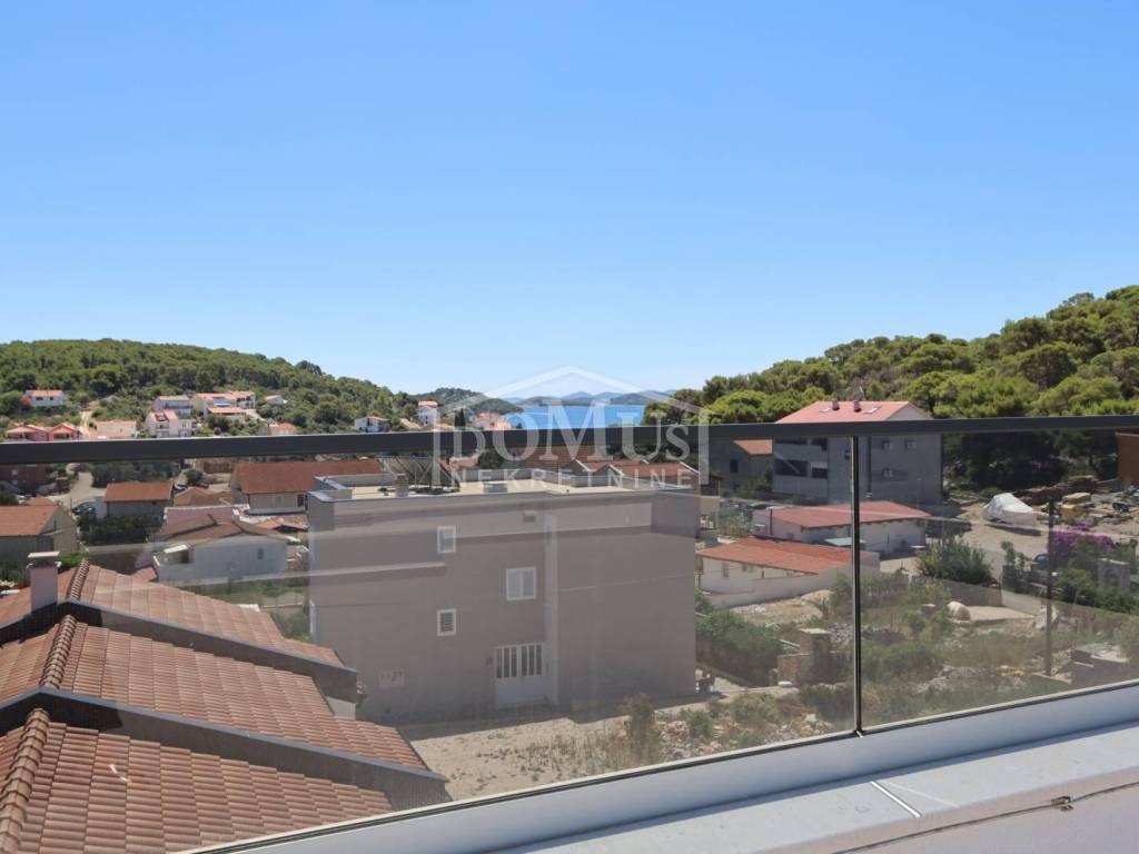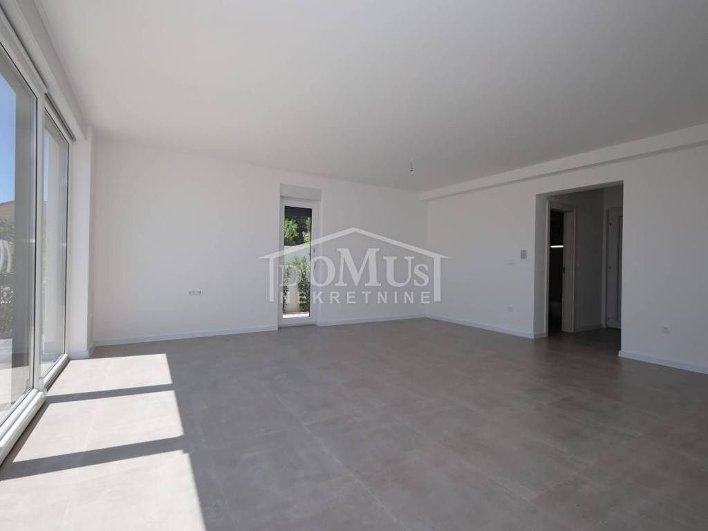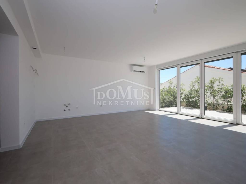Family house in Tisno, 480 m from the pebble beach. The house is a semi-detached house on three floors: ground floor, 1st floor and 2nd floor / roof terrace with a total of 96.14 m² of usable area and 30 m² of garden with a large terrace of 15 m². The ground floor of the house consists of a hallway, a bathroom, a storage room, a large living room with a kitchen and a dining room with access to a terrace with an adjoining yard. On the first floor of the house there are three bedrooms, a bathroom and a hallway. On the 2nd floor of the house there is a large roof terrace of 24.50 m² with a view of the sea. The house is completely finished and ready for immediate occupancy. It is equipped with burglar-proof doors, ALU carpentry with electrically controlled blinds, underfloor heating in the bathrooms and air conditioning in every room. The surroundings are decorated with Mediterranean plants, and the parking area is paved. The house is 300 m from the sea and 1000 m from the town center.