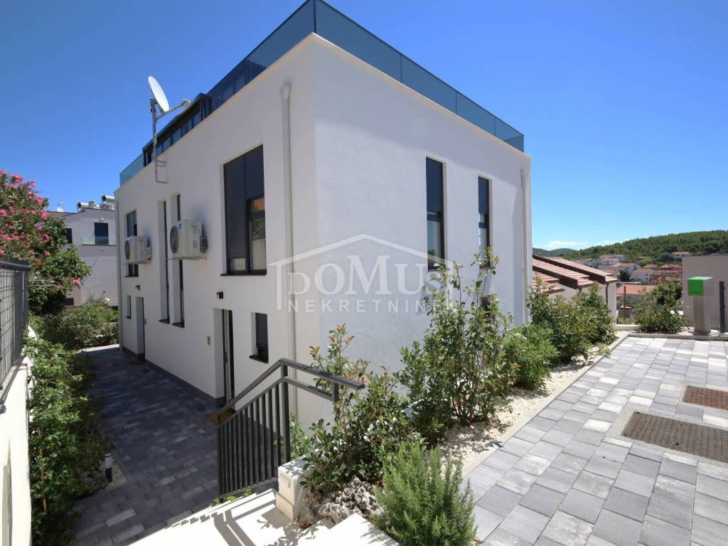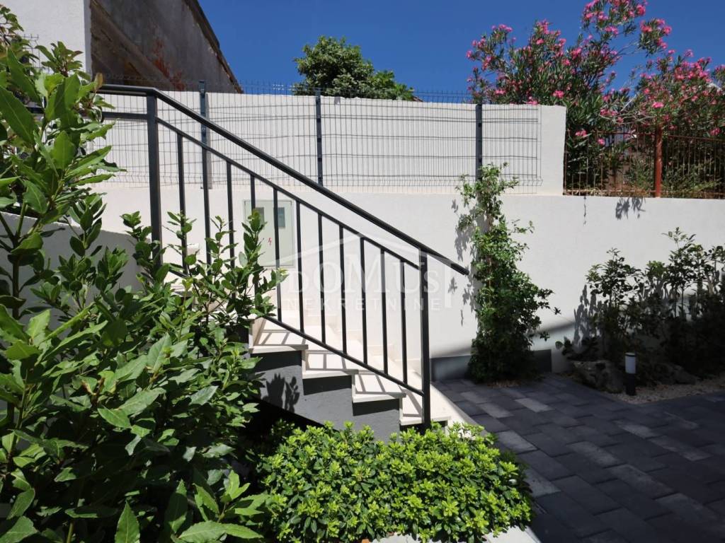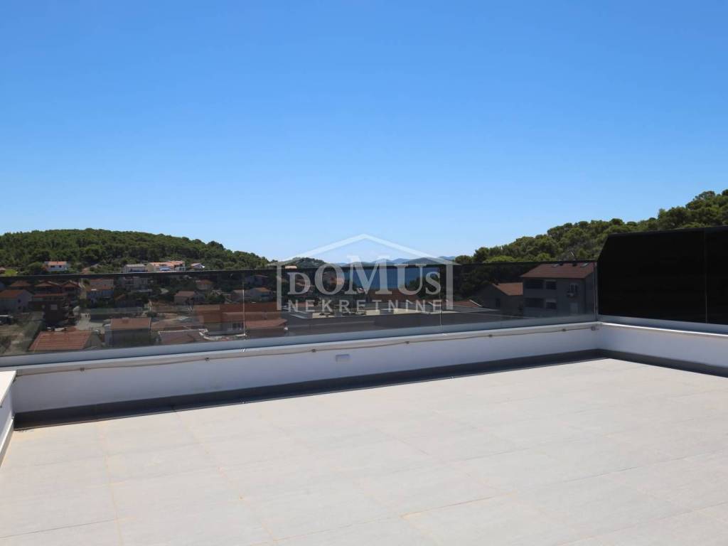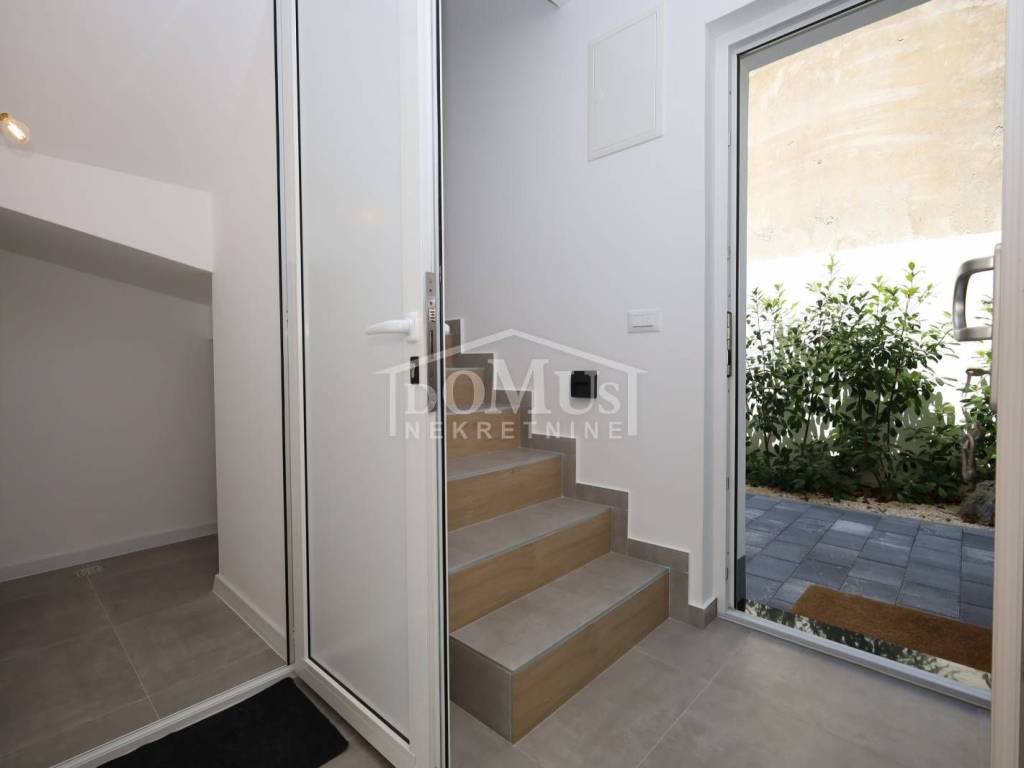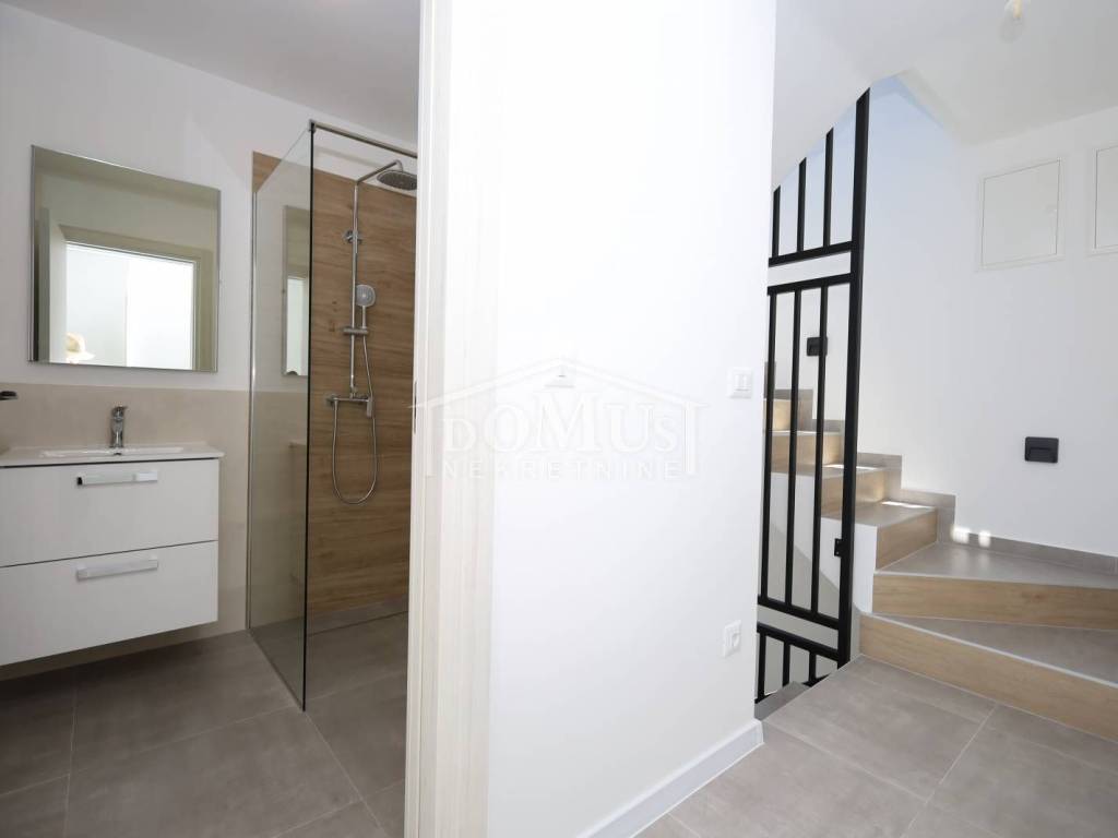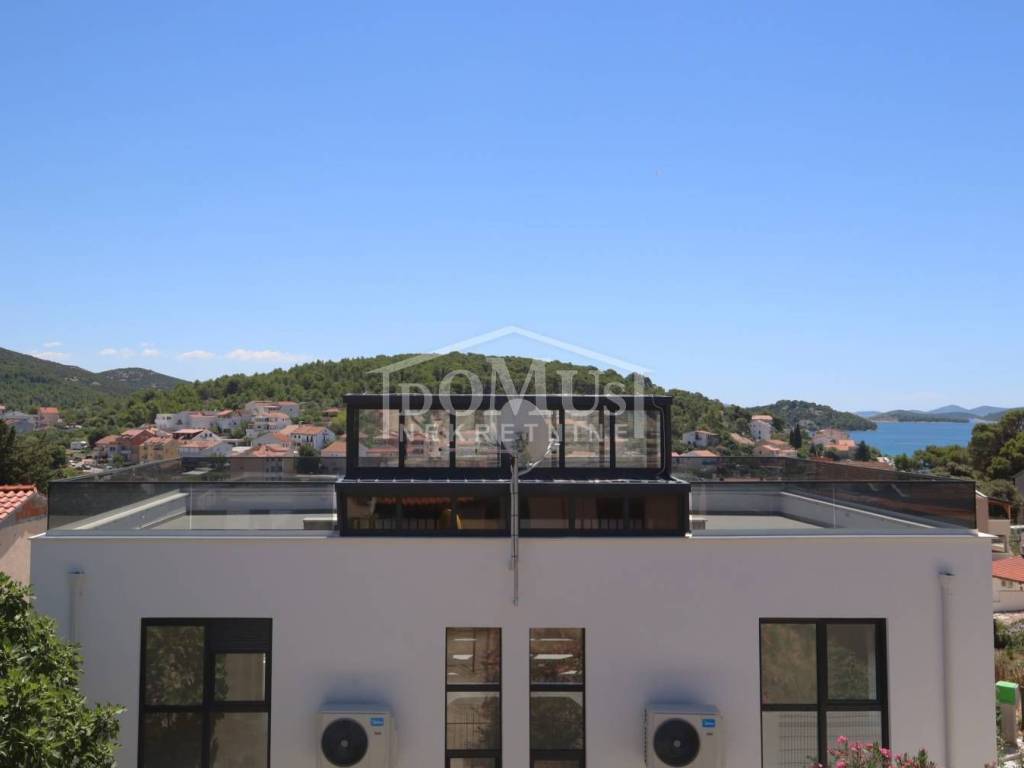 Family house in Tisno, 480 m from the pebble beach. The house is a semi-detached house on three floors: ground floor, 1st floor and 2nd floor / roof terrace with a total of 96.14 m² of usable area and 60 m² of garden with a large terrace of 15 m². The ground floor of the house consists of a hallway, a bathroom, a storage room, a large living room with a kitchen and a dining room with access to a terrace with an adjoining yard. On the first floor of the house there are three bedrooms, a bathroom and a hallway. On the 2nd floor of the house there is a large roof terrace of 24.50 m² with a view of the sea. The house is completely finished and ready for immediate occupancy. It is equipped with burglar-proof doors, ALU carpentry with electrically controlled blinds, underfloor heating in the bathrooms and air conditioning in every room. The surroundings are decorated with Mediterranean plants, and the parking area is paved. The house is 300 m from the sea and 1000 m from the town center.