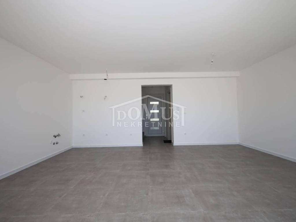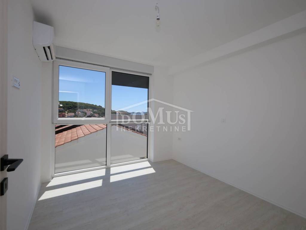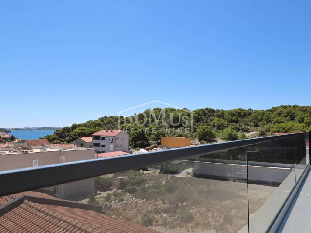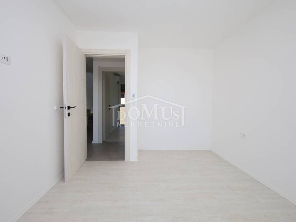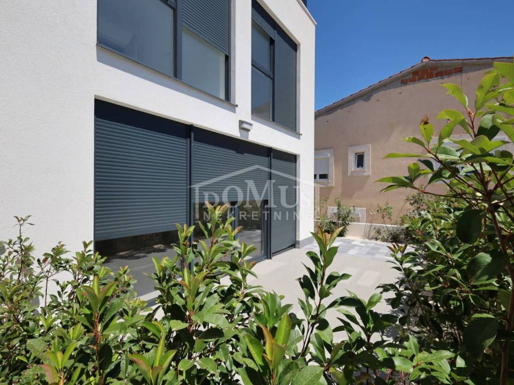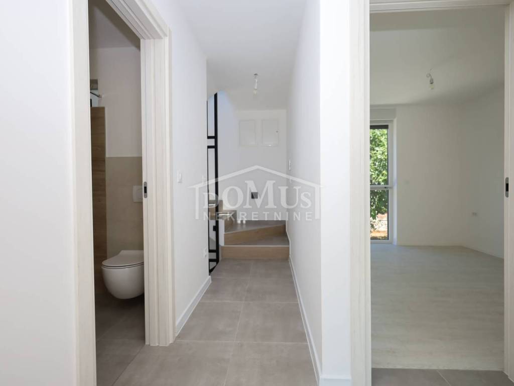 Family house in Tisno, 480 m from the pebble beach. The house is a semi-detached house on three floors: ground floor, 1st floor and 2nd floor / roof terrace with a total of 96.14 m² of usable area and 60 m² of garden with a large terrace of 15 m². The ground floor of the house consists of a hallway, a bathroom, a storage room, a large living room with a kitchen and a dining room with access to a terrace with an adjoining yard. On the first floor of the house there are three bedrooms, a bathroom and a hallway. On the 2nd floor of the house there is a large roof terrace of 24.50 m² with a view of the sea. The house is completely finished and ready for immediate occupancy. It is equipped with burglar-proof doors, ALU carpentry with electrically controlled blinds, underfloor heating in the bathrooms and air conditioning in every room. The surroundings are decorated with Mediterranean plants, and the parking area is paved. The house is 300 m from the sea and 1000 m from the town center.