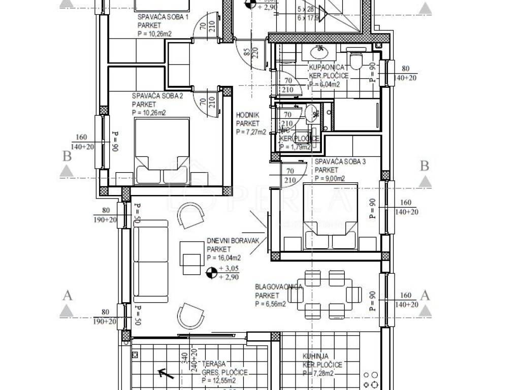 The apartment consists of: Kitchen with dining area and living room, hallway, three bedrooms, two bathrooms with toilet, additional toilet and large loggia.