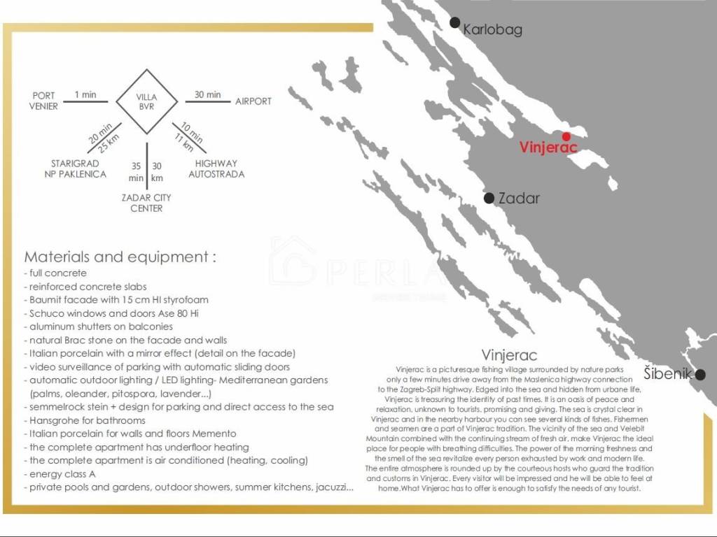 Thanks to the long-standing experience of the investor and his team of people involved in the project, the apartments are equipped with quality materials and equipment: -Baumit white facade with 15cm of thermal insulation -part of the facade covered in black porcelain with a mirror effect -all the surrounding walls covered in Brač stone -paths in the gardens and uncovered terraces paved with Semmelrock slabs -aluminum sliding shutters on the terraces -schuco Ase60 lift-and-slide panoramic walls from floor to ceiling -reflex gray tempered-laminated glass in the panoramic walls -complete underfloor heating -complete air conditioning of the apartment -floors inside the apartment tiled with Spanish porcelain Golden Blanco dim.1.2*1.2 -bathroom walls tiled with Spanish porcelain Golden Blanco dim.60*1.2 -walk-in shower cubicles tiled with anti-slip mosaic Golden Blanco dim.30*30 -terraces, balconies tiled with anti-slip Spanish porcelain Golden Blanco matt, dim.60*120 -built-in bathroom sanitary ware Hansgrohe -built-in Tece cisterns with slow-closing toilet seat -garden illuminated with LED lighting Extremely quiet location with panoramic views of the sea and Velebit mountain. Ownership neat 1/1.
