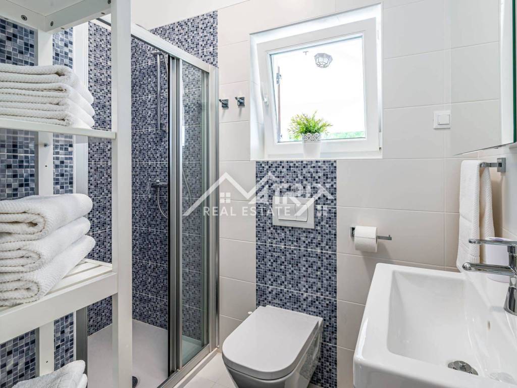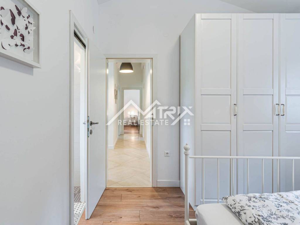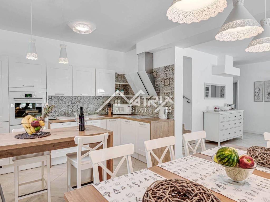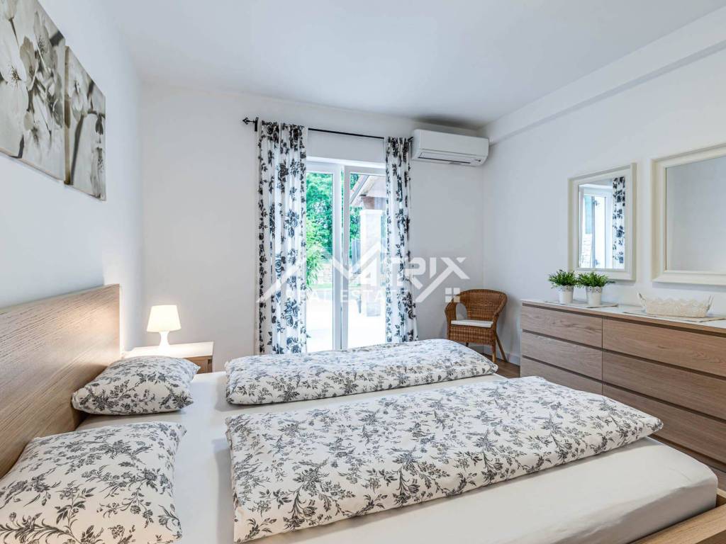Set on a 669 m² fully fenced plot with a beautiful stone wall, the exterior includes a heated 32 m² pool with a sunbathing area, a covered terrace, and a shaded outdoor kitchen with barbecue – ideal for outdoor gatherings. Mediterranean plants decorate the garden, supported by an automatic irrigation system.