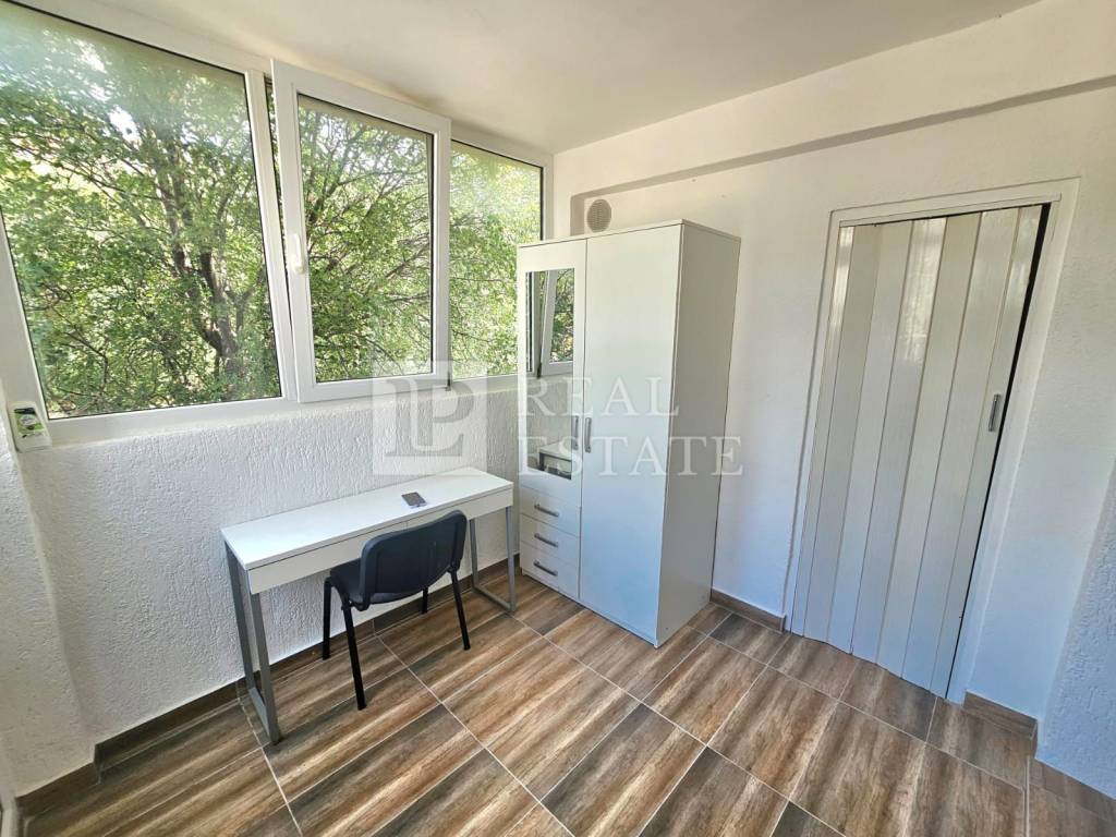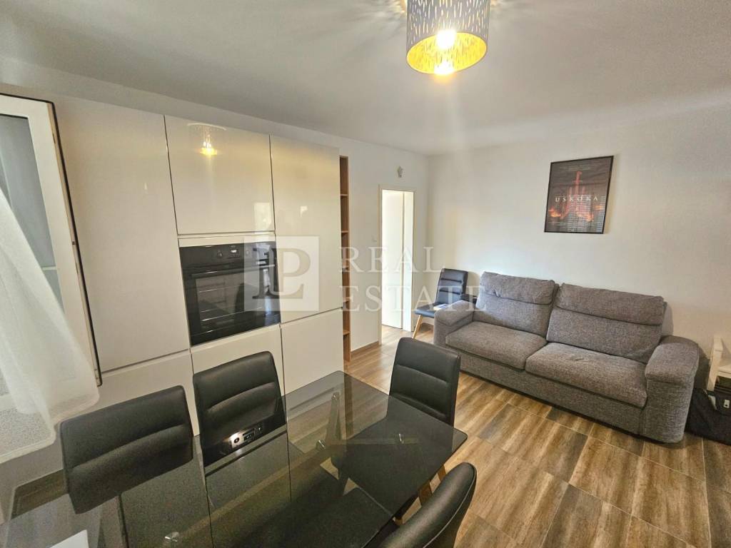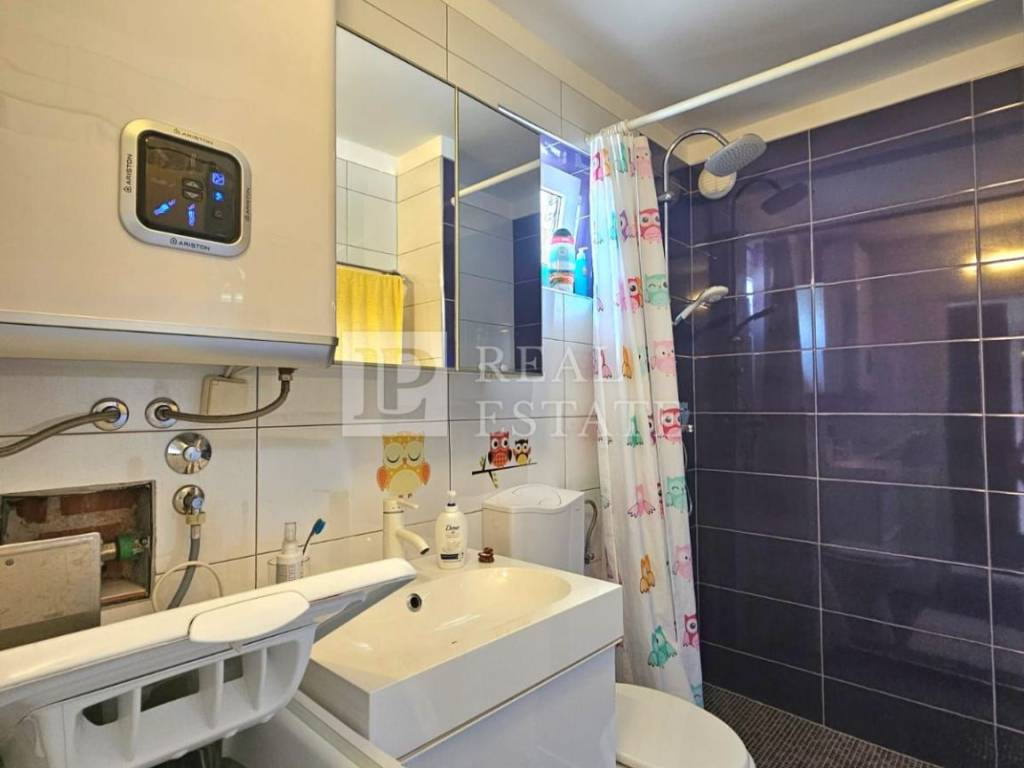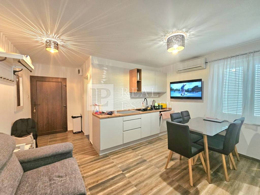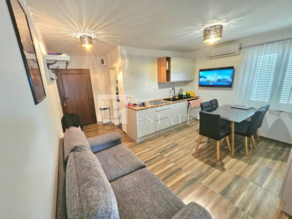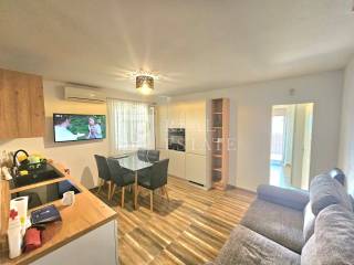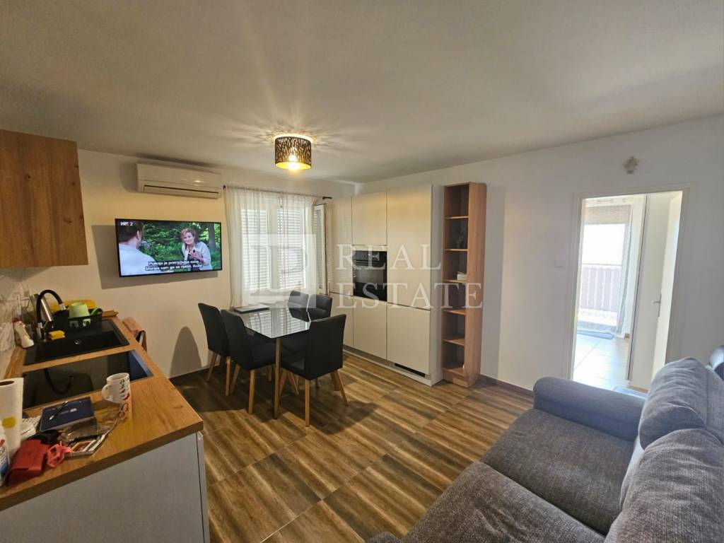 The apartment is located on the first floor of a smaller residential building, and consists of an entrance hall, entrance hall, bathroom, living room, kitchen with dining room, bedroom, storage room and balcony. The bedroom opens onto a balcony with an open view of the sea.