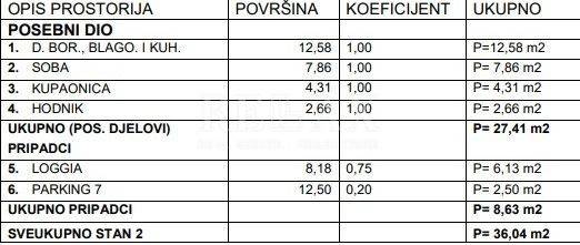 The apartment has a total area of 36.04 m² and consists of an entrance hall, bedroom, bathroom, living room connected to the kitchen and dining area, and a covered loggia of 6.13 m². The living space of the apartment is 27.41 m², and it also includes an outdoor parking space of 2.50 m² in the building’s courtyard.