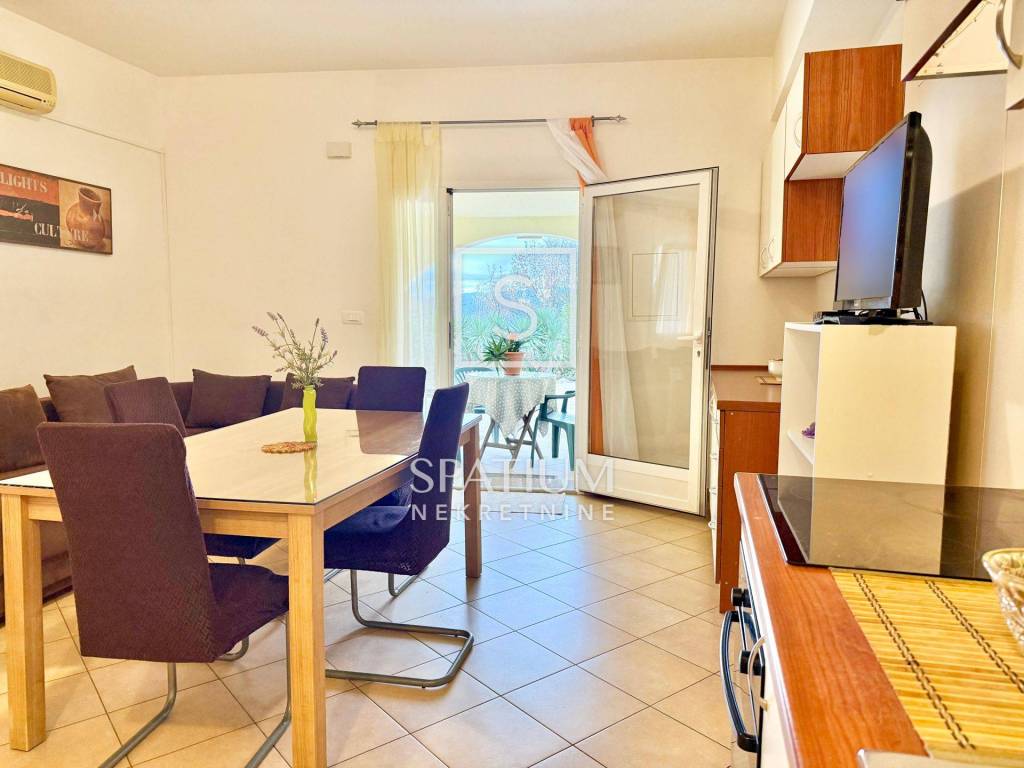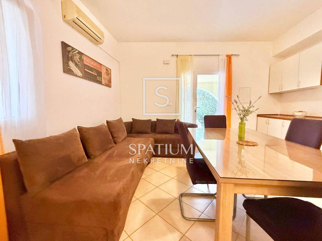 The apartment consists of a living area with a kitchen, a bedroom and a bathroom. The living area of the apartment opens onto a spacious eastern terrace and a covered southern terrace with a sea view. In a quiet and pleasant location, this property offers exceptional quality of living. The immediate vicinity of an elementary school, kindergarten, shops, public transport and other supporting facilities make it ideal for family life. The apartment is fully furnished and is rented as such.