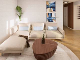 The apartment consists of two bedrooms, a bathroom, a spacious living room with a kitchen and dining area, and a large terrace enclosed with glass walls. The bathroom is equipped with high-quality sanitary ware from renowned manufacturers, including electric underfloor heating with remote control via Wi-Fi. Heating and cooling throughout the apartment are provided by a DAIKIN multi-split system with three indoor units, also controllable via a mobile app.