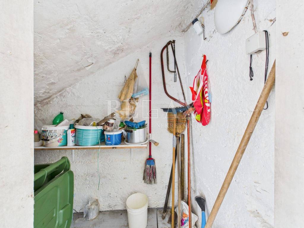 The apartment faces south, ensuring plenty of natural light throughout the day, and offers a stunning sea view from the living room. It consists of two bedrooms, a living room, a kitchen with dining area, a bathroom, a summer kitchen, a storage room, and an additional pantry under the stairs. The apartment opens onto a terrace, a perfect spot for relaxing, spending time outdoors, or enjoying warm summer evenings.