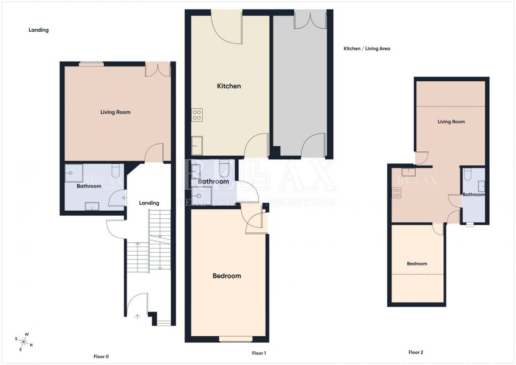 The first floor features one bedroom, a bathroom, and a spacious living room with access to a large balcony offering a stunning sea view. The next floor includes two bedrooms, a bathroom, a separate toilet, and a kitchen with a dining area, along with another large balcony with a sea view. In the high attic, there is a kitchen with a dining area, a living room, a wardrobe, a bedroom, and another bathroom.