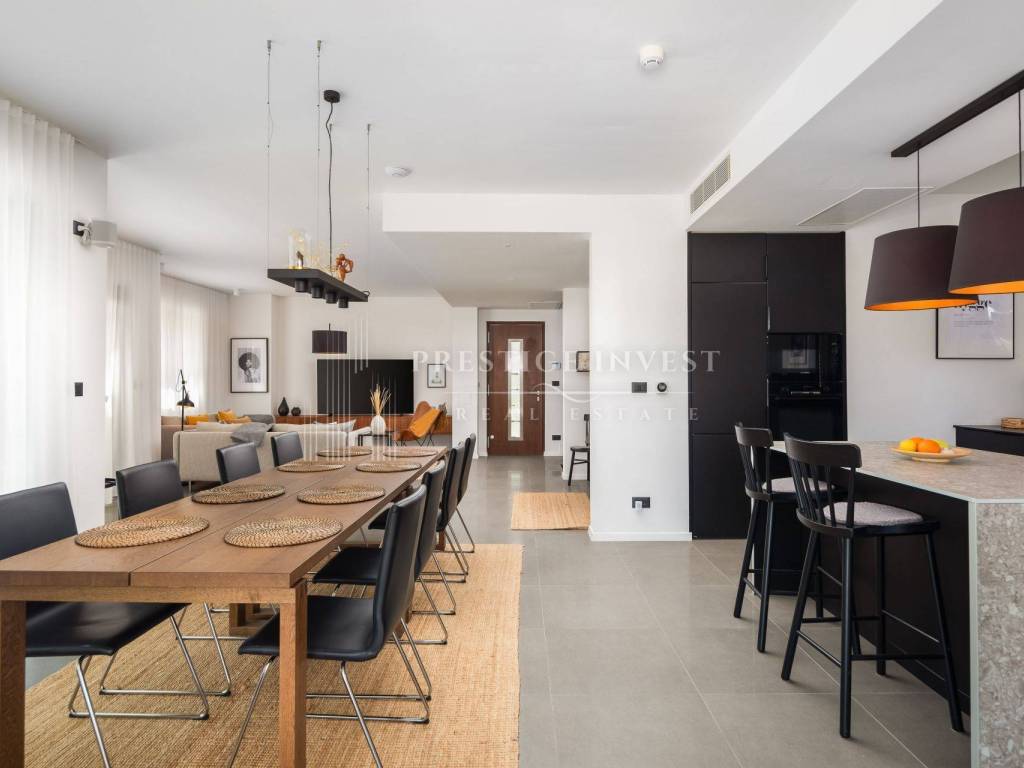 On the first floor there is a large living room with a modern kitchen and a spacious dining room, as well as an exit to a large terrace and a covered living room with a heated pool and solarium.
