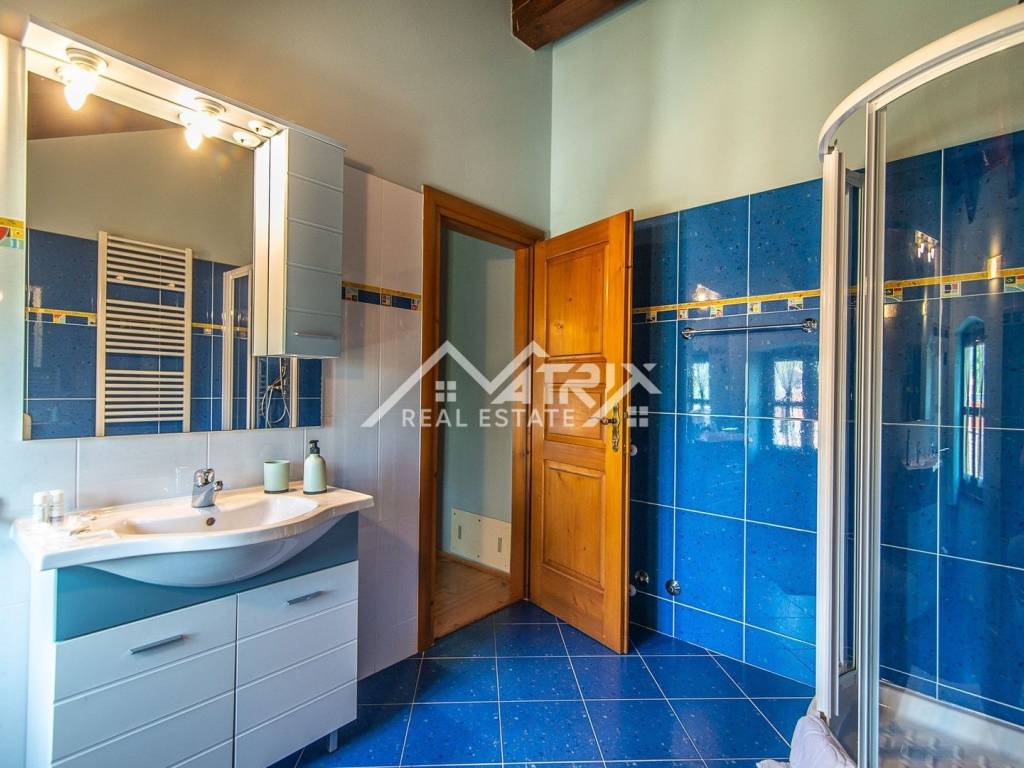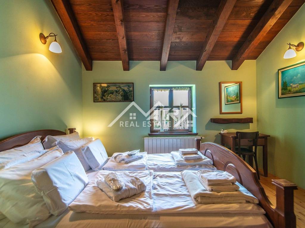 The villa is spread over two floors, the ground floor and the first floor. At the very entrance there is a spacious lobby, on the left there is a living room with a fireplace for a special atmosphere during the winter. Also, on the ground floor there is a fully equipped kitchen and a rustic dining room. On the ground floor, there is also a guest toilet under the staircase, and many other facilities, such as its own wellness oasis with a jacuzzi and sauna, and an entertainment room with billiards and exercise equipment. On the first floor of the house there are as many as 4 bedrooms, each with its own bathroom.