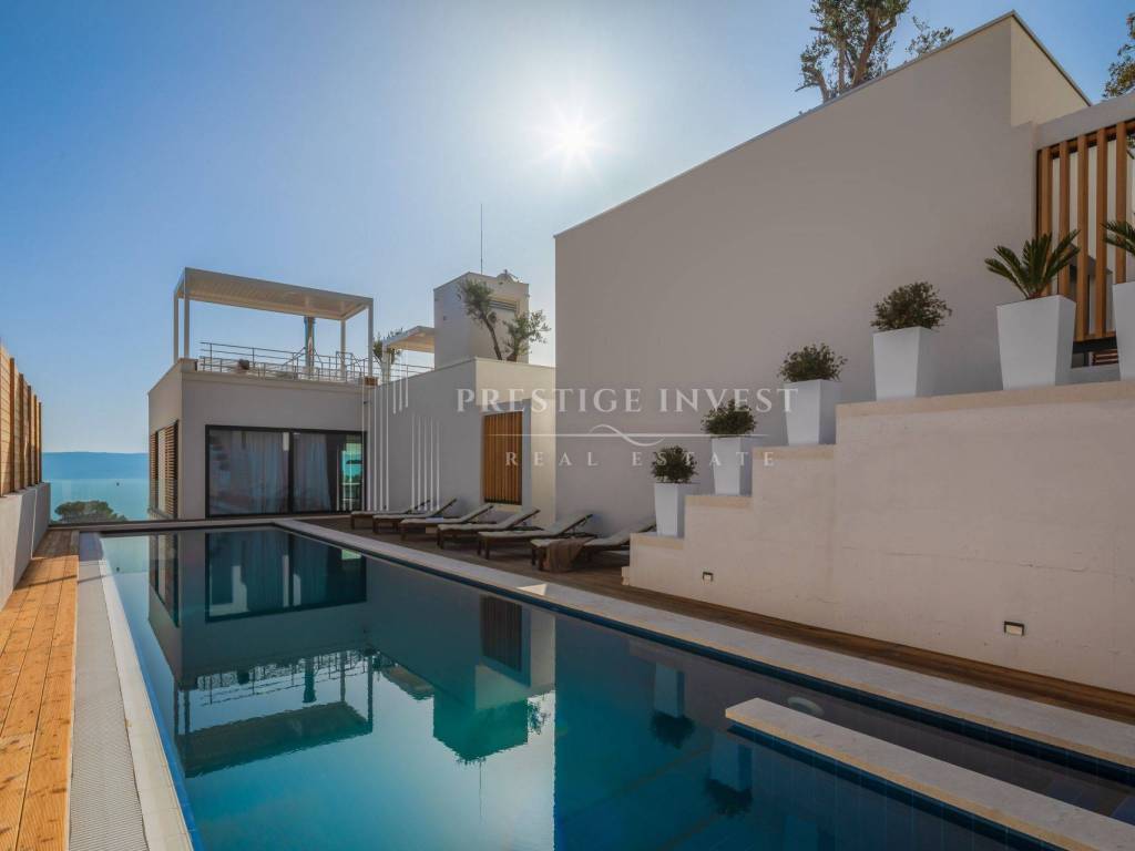 and unobstructed view of the islands of Brac, Hvar and Korcula and the entire Makarska Riviera. On the roof terrace which extends to 93 m2 there is a summer kitchen with gas grill, stone sink, mini fridge, ice maker, dining table for eight people, two bioclimatic pergolas and additional space for socializing and sunbathing.