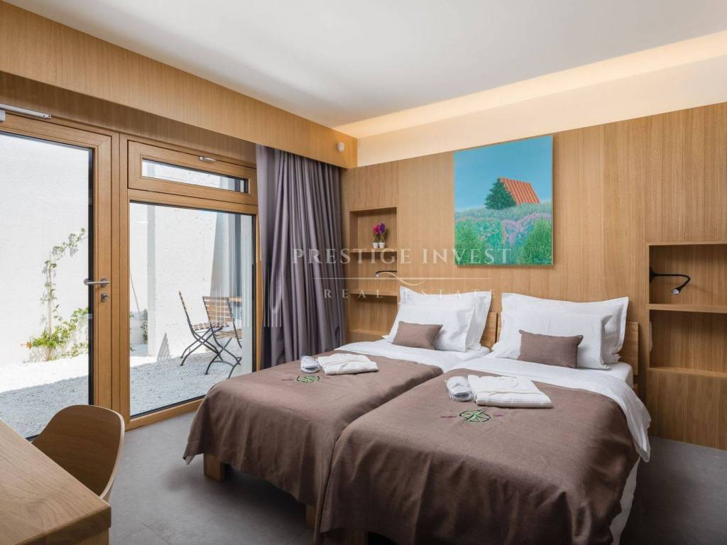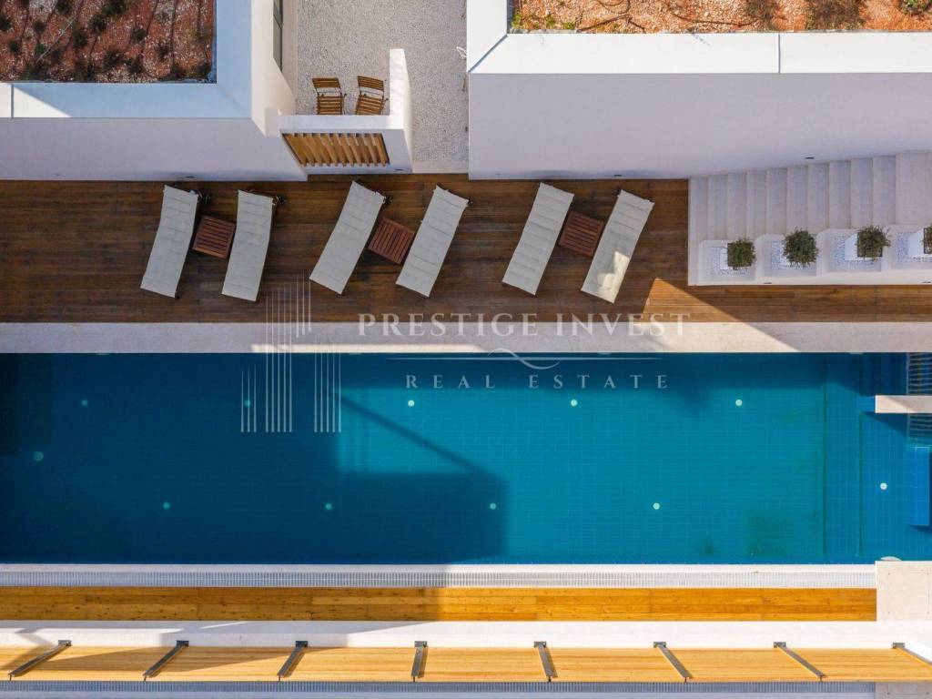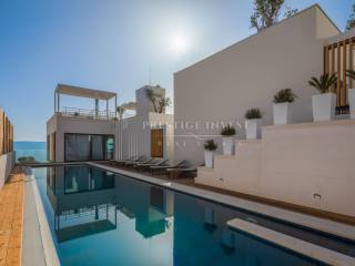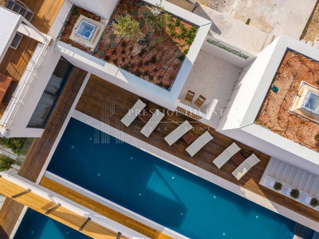 Communication from the ground floor to the roof takes place by elevator or stairs. Both villas are specific for the green roofs of the rooms and living room and on each of these roofs there is an olive tree surrounded by Mediterranean plants. Apart from being an aesthetically pleasing detail, green roofs also serve as thermal insulation of the rooms above which they are located, thus saving energy. Access to elevators, electric car chargers and premises is via coded cards.