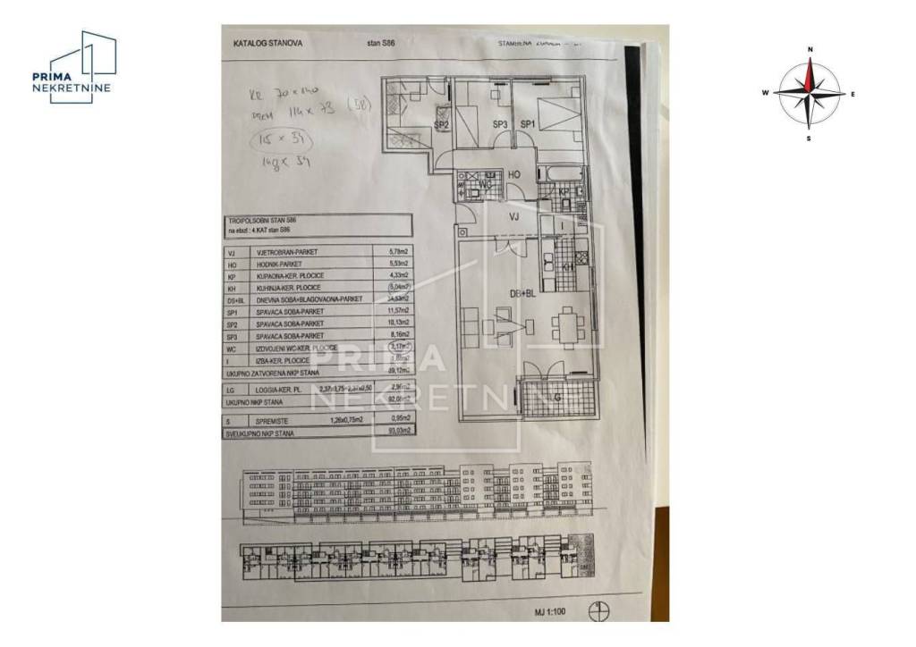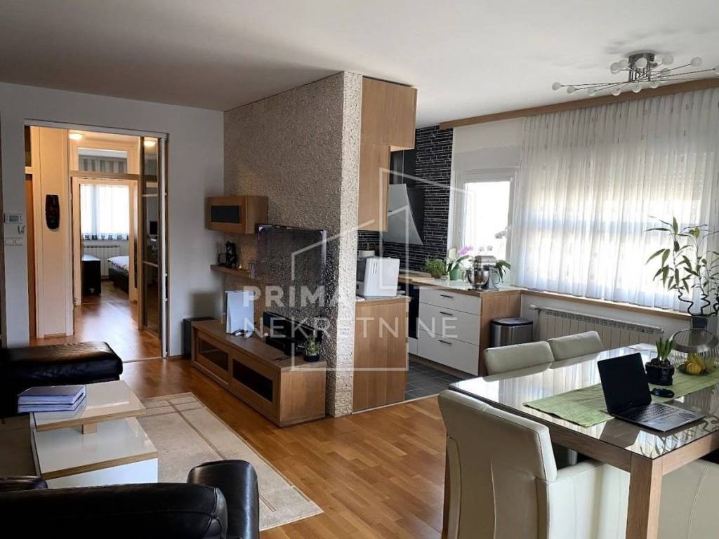 The apartment consists of a living room connected to the kitchen and dining area, two bedrooms, a bathroom, a separate WC, a hallway, and a closed loggia of 4.72 m². Additionally, it includes a storage unit of 1.25 m² located in the building’s basement.
