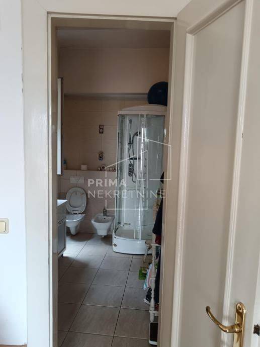 The interior is divided into two functional units, allowing flexible use of the space—ideal for a combination of residential and business purposes. The layout includes an entrance hallway, two rooms, a living room, a kitchen with dining area, a master bedroom with en-suite bathroom and toilet, an additional bathroom, and a separate guest toilet. Thanks to its triple orientation (east, north, and south), the apartment is filled with natural light throughout the day, creating a pleasant and airy atmosphere.