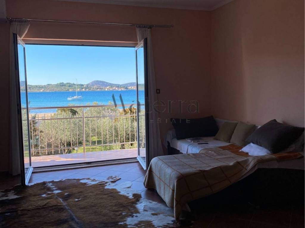 FIRST FLOOR: A large open space living area with access to a balcony spanning the entire width of the house, offering views of the sea and surrounding islands, two bedrooms, a bathroom, and a toilet.