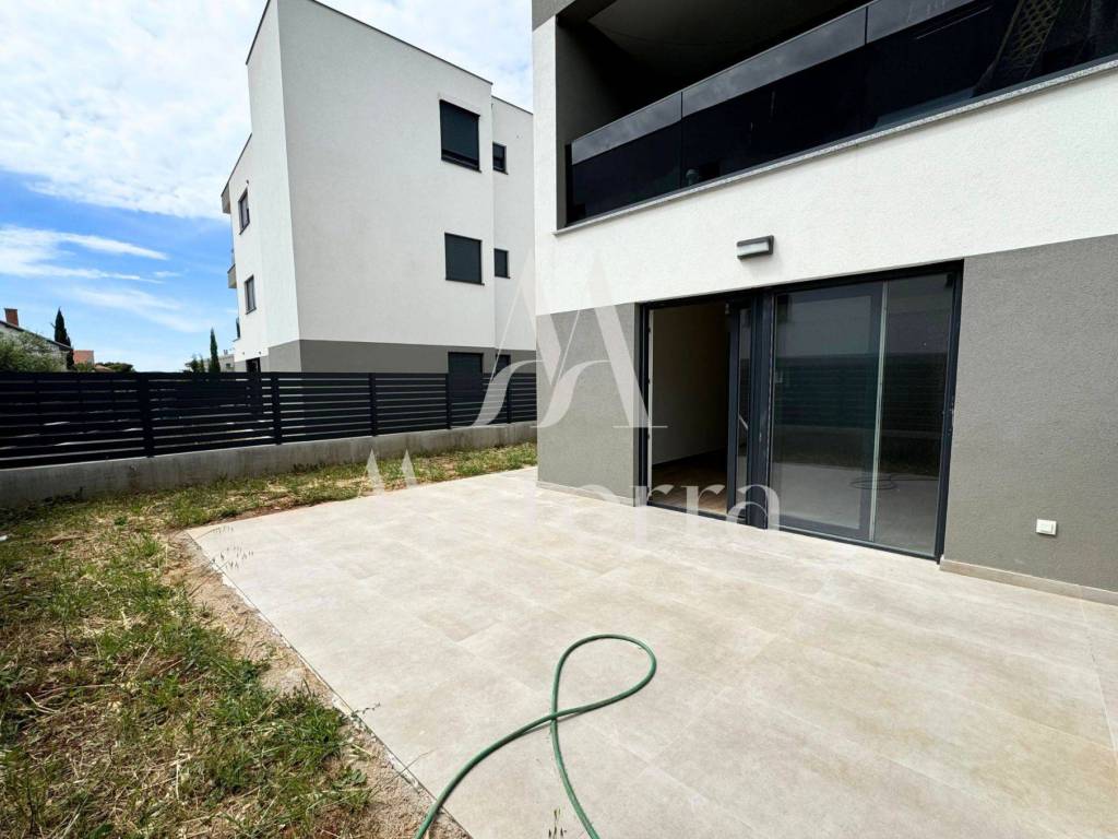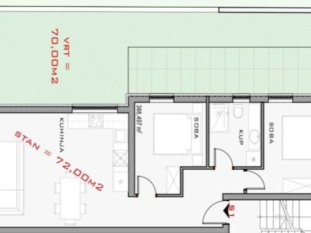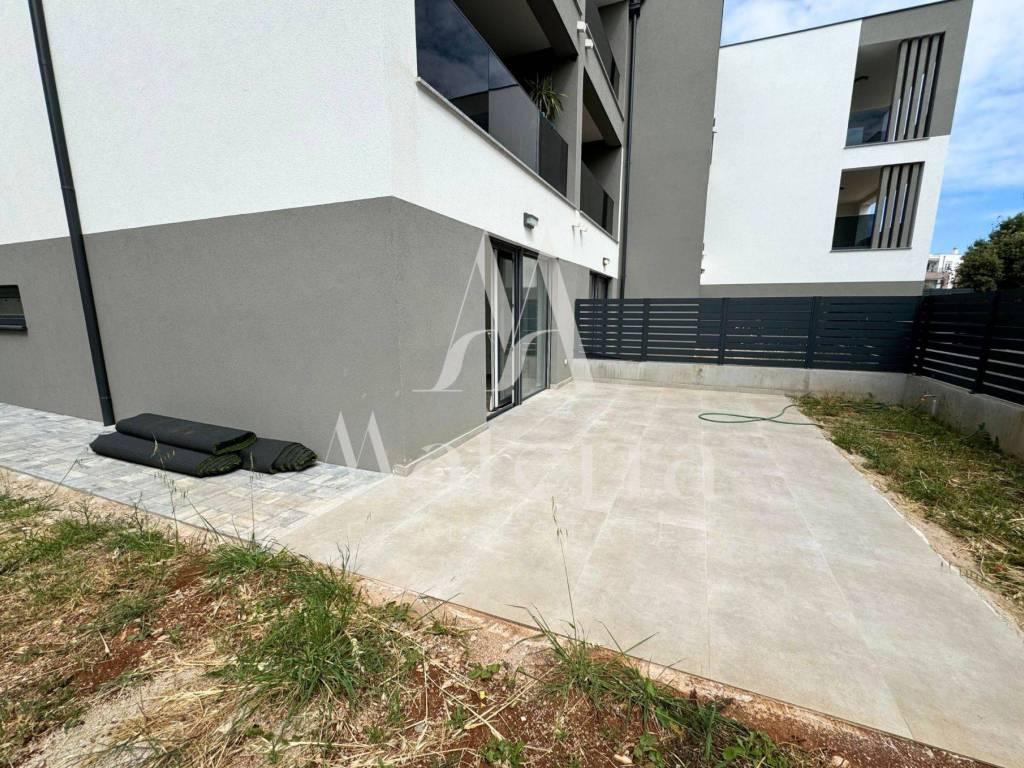 The apartment is located in a completed building on the ground floor, with a living area of 72m² + 20m² terrace + 70m² garden.