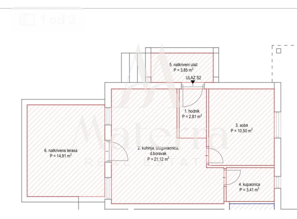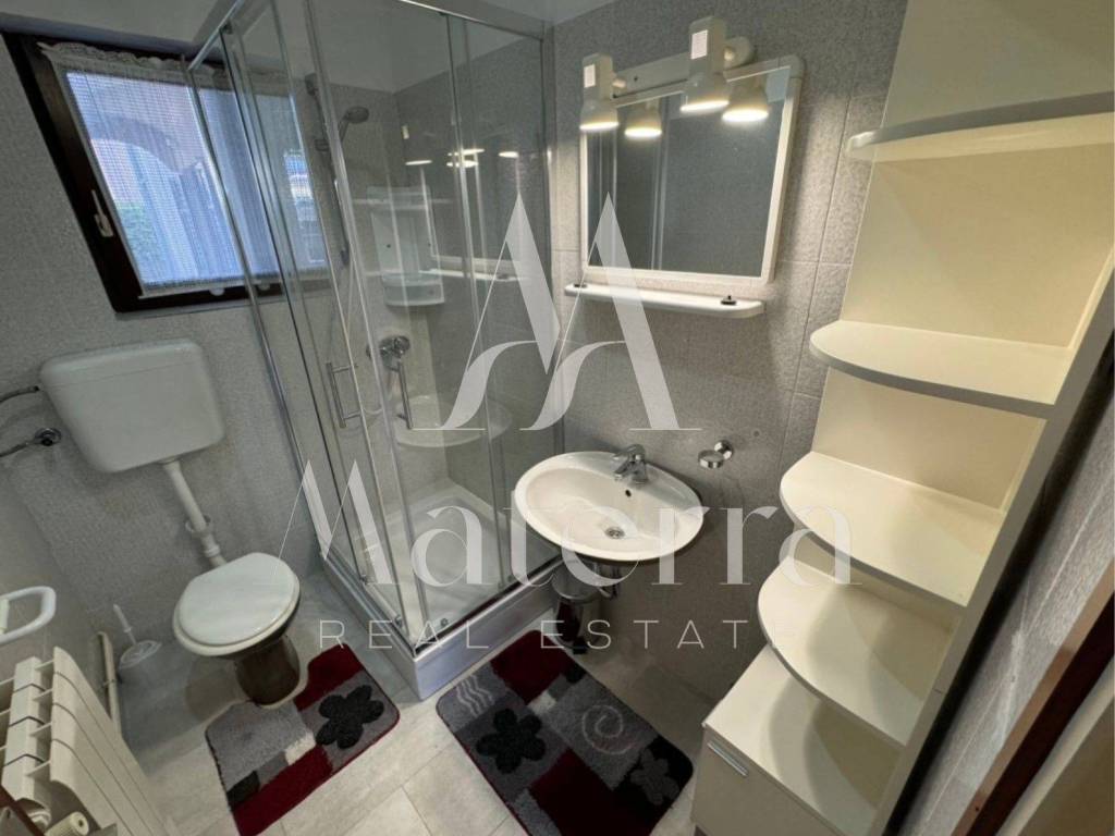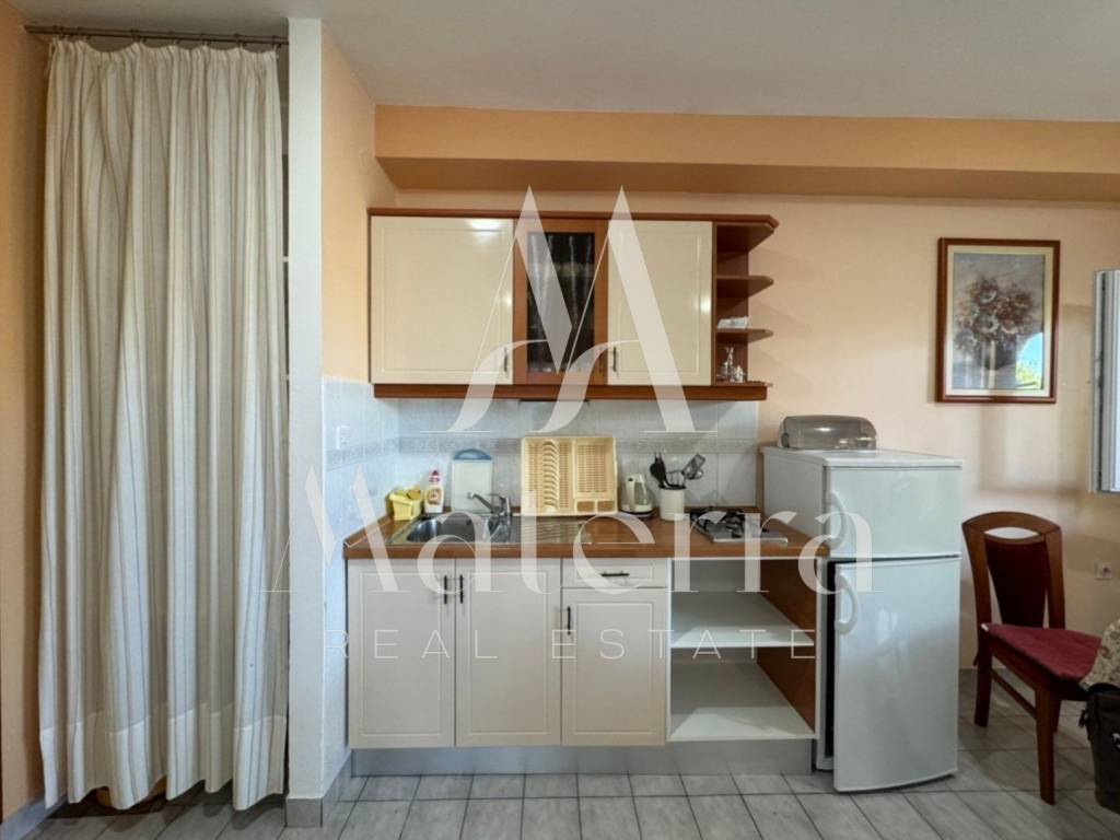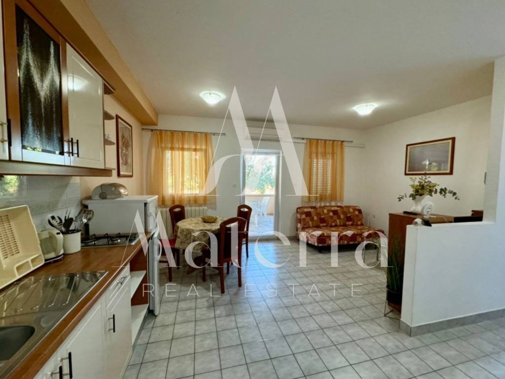 The apartment consists of an entrance hallway, a living room/kitchen/dining area with access to a spacious covered terrace of 14.91 m², and from the terrace, there is access to a garden with olive trees of 40 m². The apartment has 1 bedroom and a bathroom with a shower. The apartment is equipped with central heating, air conditioning, PVC windows... The apartment also includes a storage room. Ownership is clean 1/1 - no encumbrances. Registered.