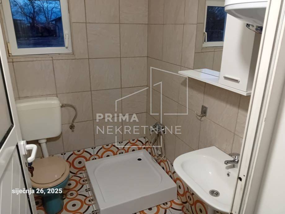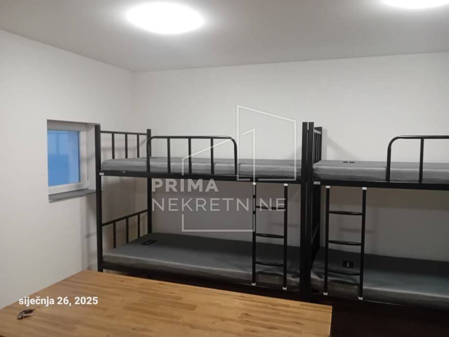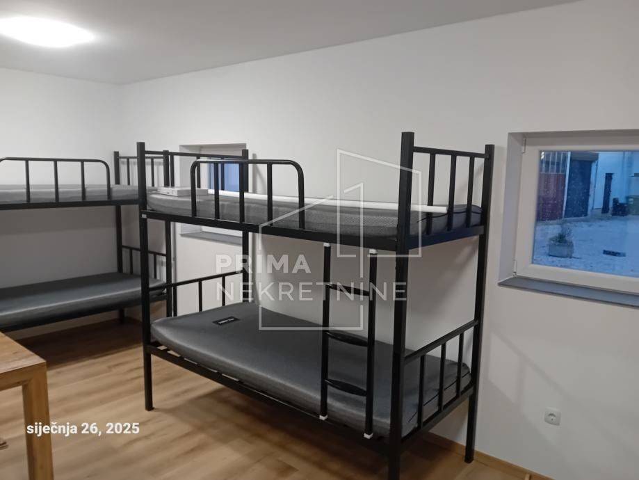 A detached house of 50 m², built in 2017, is available for rent in Brezovica, ideal for accommodating up to six foreign workers. The space is bright and spacious, designed as an open-plan layout with a kitchen and dining area, along with a separate bathroom. Heating is provided by a pellet stove. In front of the entrance, there is a large courtyard with parking availability. The house is situated in a quiet and well-maintained street, surrounded by greenery and family homes. A bus stop is just 300 meters away, while all necessary amenities are within a 1 km radius.