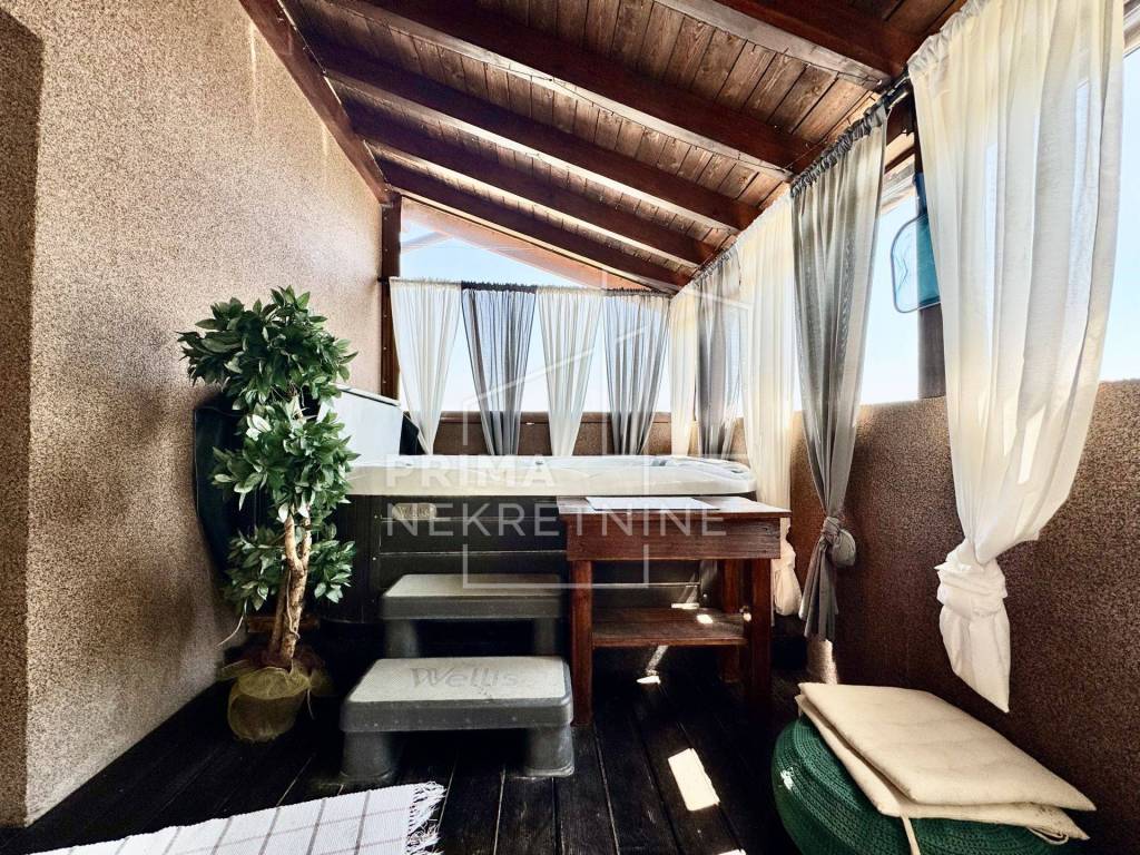 The house comprises a basement, ground floor, and attic. The ground floor includes a storage room, bathroom, dining area, living room with kitchen, and access to an uncovered terrace with a jacuzzi. The attic features a bathroom and a large living room.