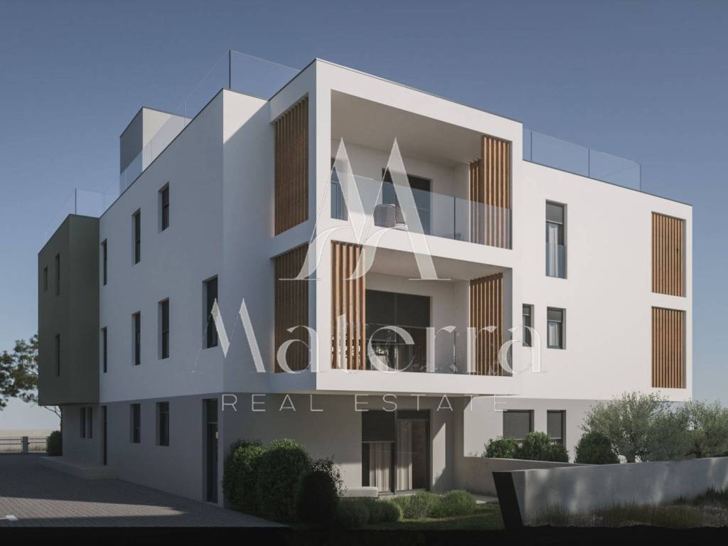 Apartment A2, located on the ground floor of a modern new building in the Vodice area, near Šibenik, is for sale. The total area of the apartment is 96.76 m², and it consists of an entrance, a living room and kitchen with dining area, two bedrooms, a WC, a bathroom, and access to a terrace and yard, with its own parking space. The building is being constructed according to contemporary building standards, with an emphasis on high-quality materials and finishes. The equipment will include premium carpentry, modern ceramics, and high-quality sanitary fixtures. The location is ideal both for everyday living and for vacations, as the beach is only 500 meters away. Completion of construction is planned for 2026.