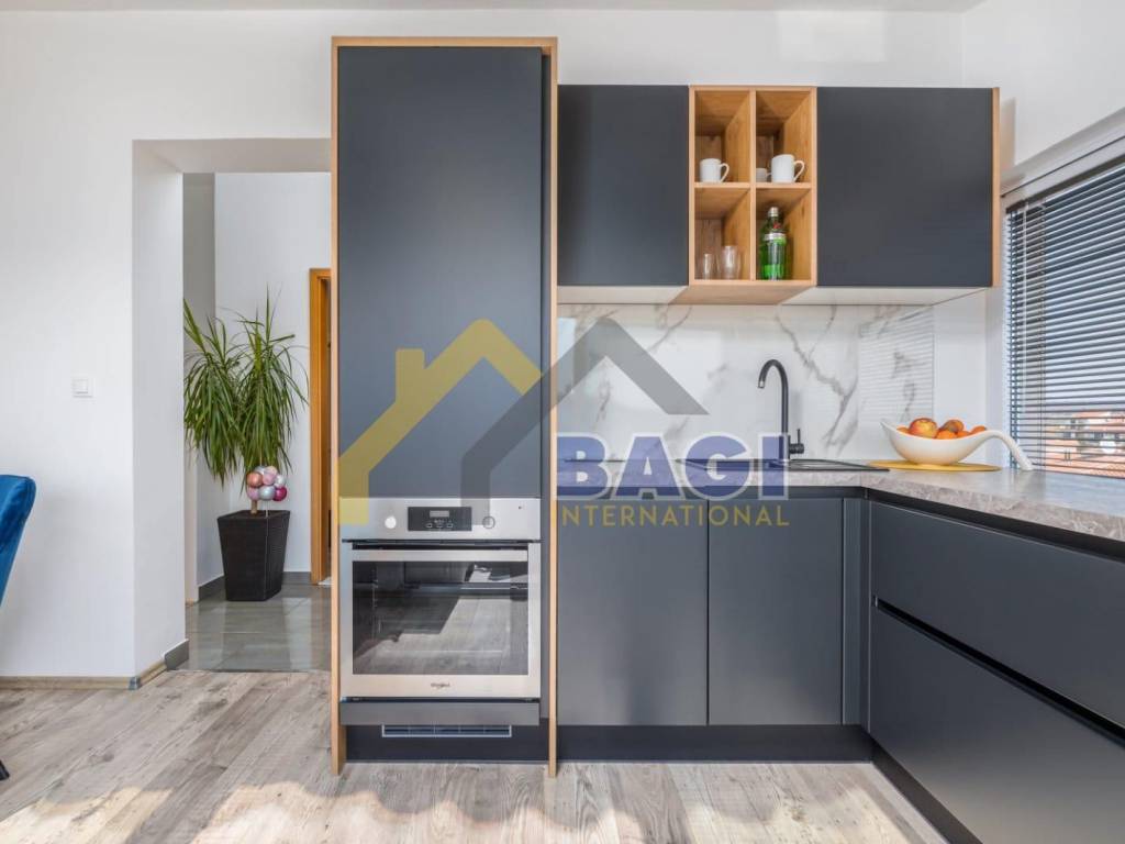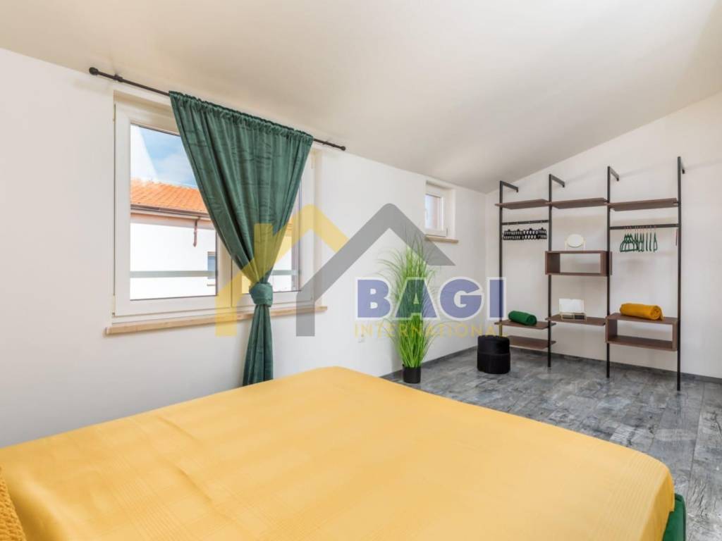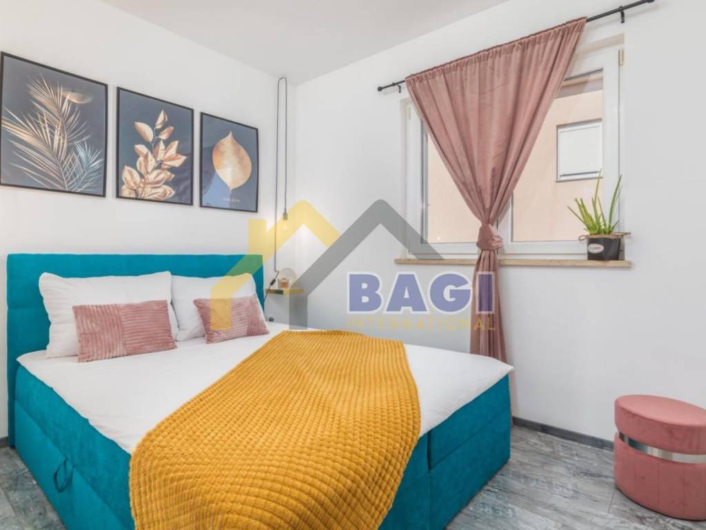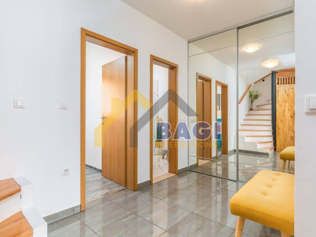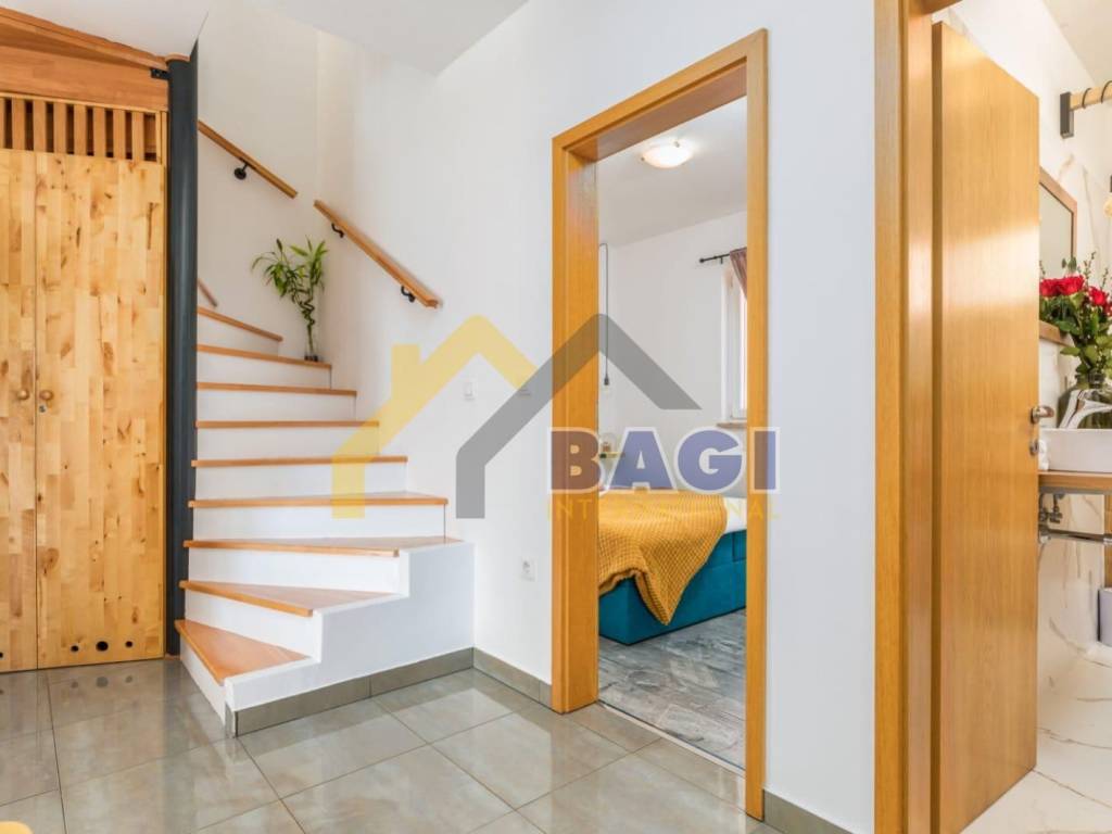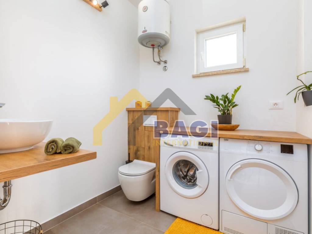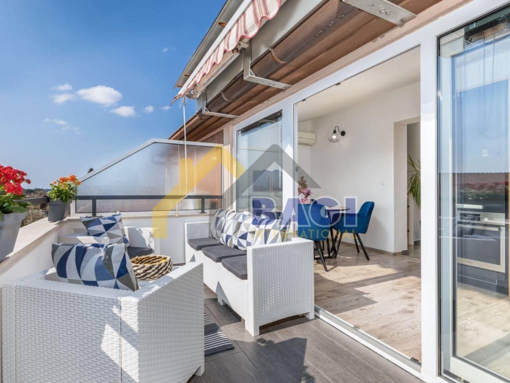 For sale is a beautiful apartment located in Valbandon, 500 meters from the sea and beaches. The apartment is two-story, first and second floor, and its total size is 76.27m2. It consists of a hallway, living room, two bedrooms, bathroom, kitchen with dining area, toilet and laundry room, and a sunny terrace. It was luxuriously decorated in 2022. The apartment also has a parking space.