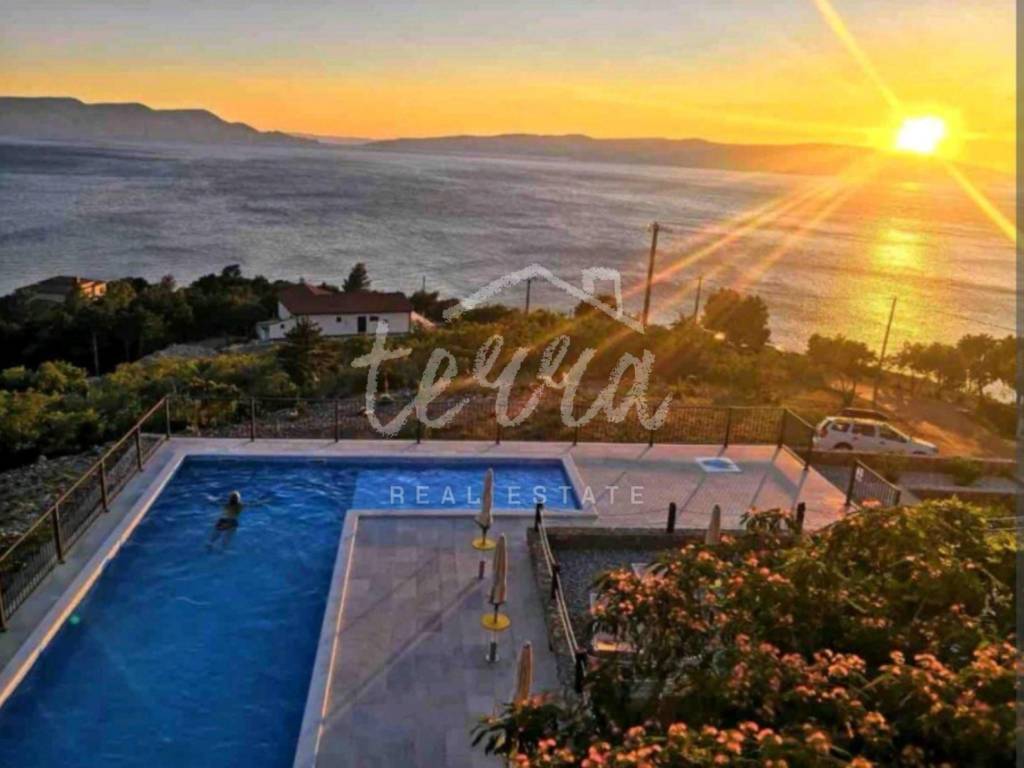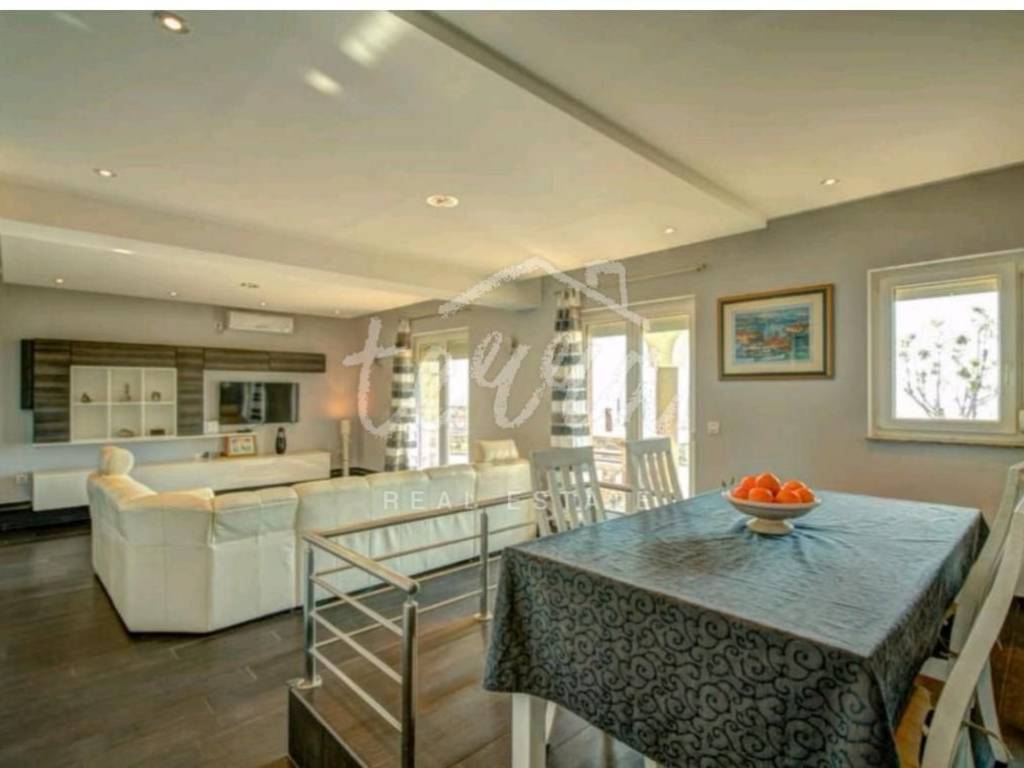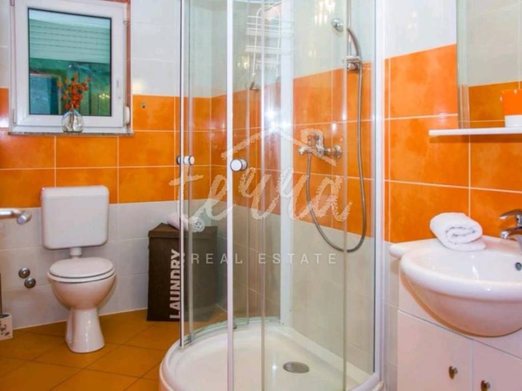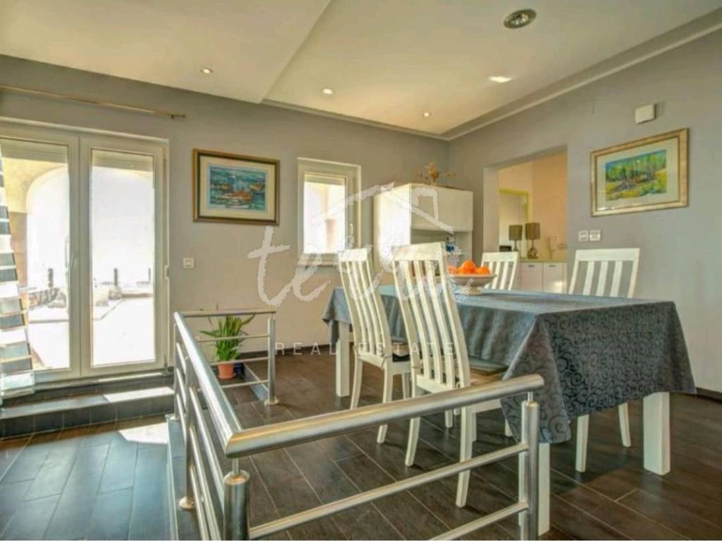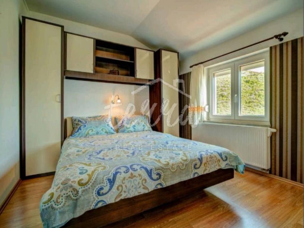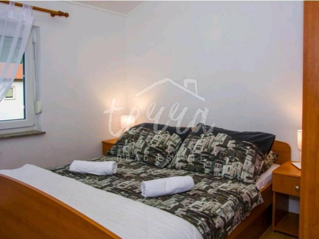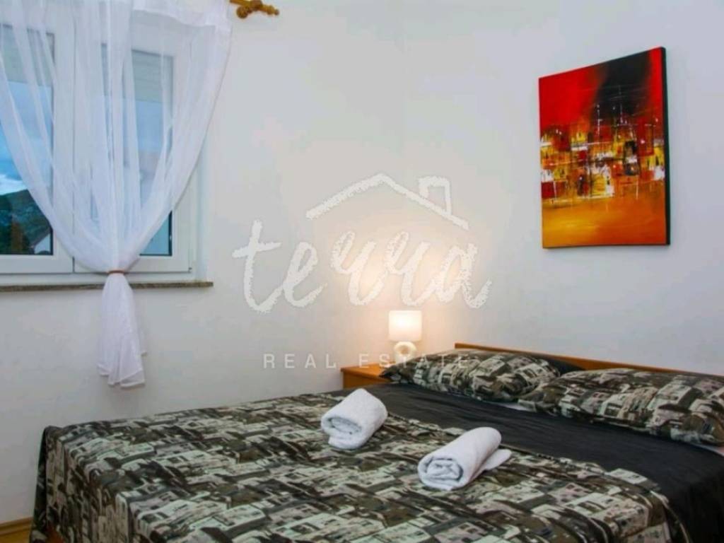 We are selling a house with five residential units, a tavern, a swimming pool of 64 m2 and a building plot of 360 m2. The house consists of a ground floor, two floors and an attic. The ground floor has a garage, two bedroom apartment with two bathrooms, kitchen, dining room and open plan living room. The ground floor apartment has underfloor heating. On the first and second floor there are four two-bedroom apartments with beautiful sea views. One apartment has central pellet heating. The whole house is air conditioned. The attic can be converted into living space. Property in a well-established tourist rental. Location beautiful ideal for relaxation and enjoyment.