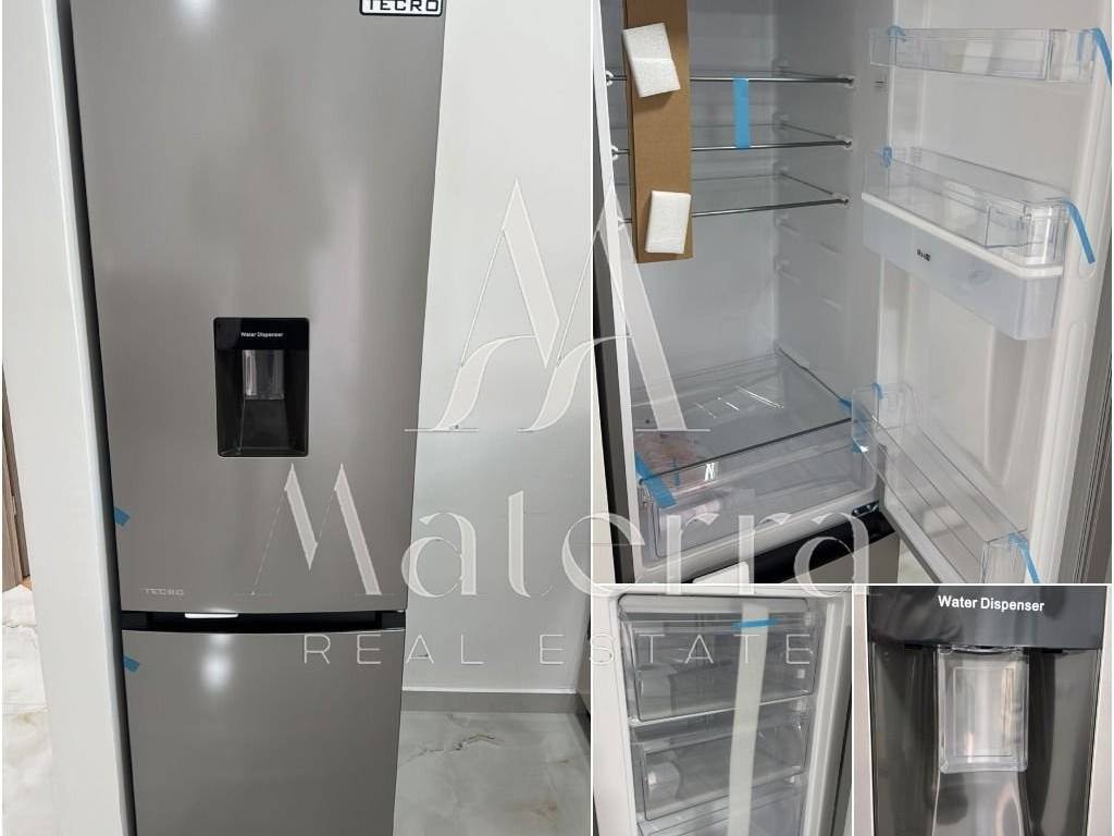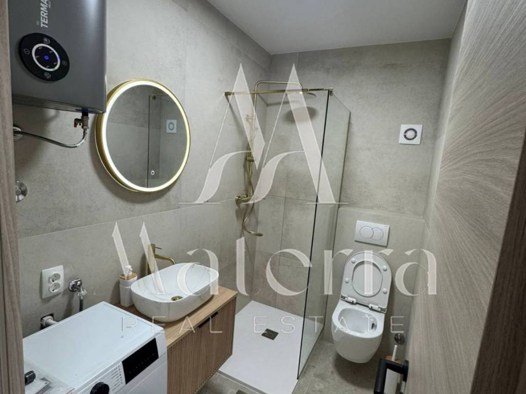 The bathroom is equipped with a walk-in shower, a Geberit toilet, a Gorenje washing machine, and an LED mirror. The kitchen is custom-made and fully new, featuring a Whirlpool oven and cooktop, a Candy dishwasher, and a refrigerator.