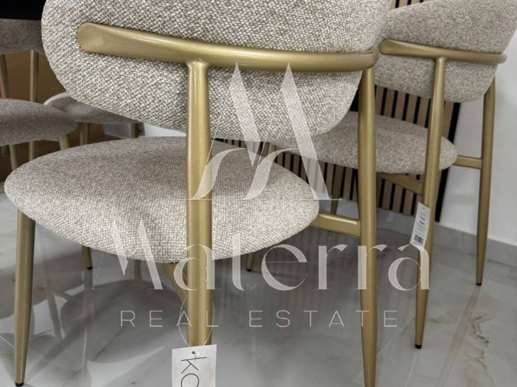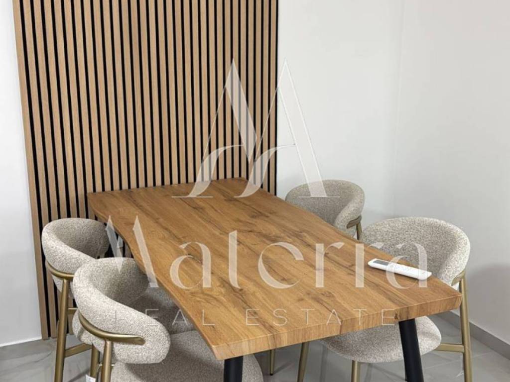 The living room includes a Vivax inverter air-conditioning unit (3.5 kW for heating and cooling), a Philips UHD TV, a dining table with chairs, a new sofa, and decorative wooden wall panels. The apartment features completely new electrical installations, modern LED lighting throughout, and is sold fully furnished, ready for immediate use without any additional investment.