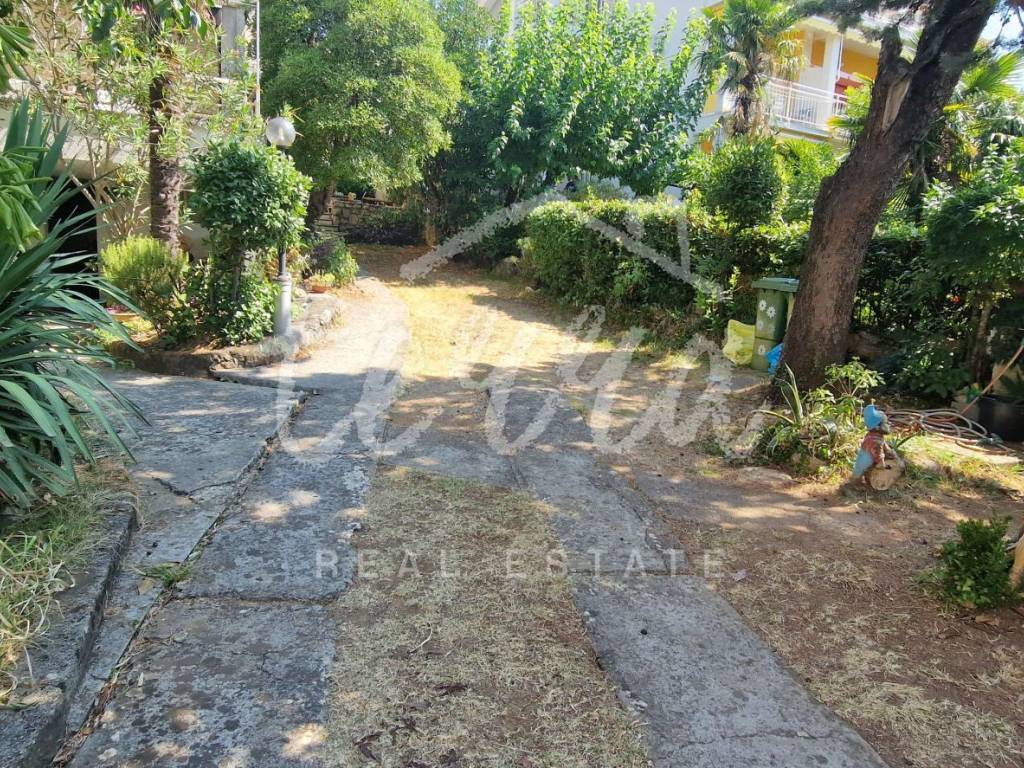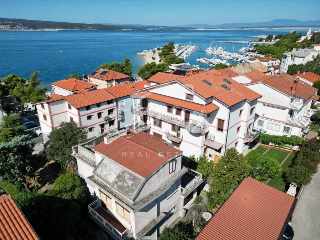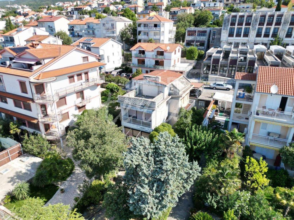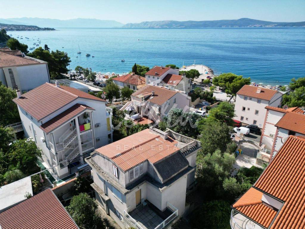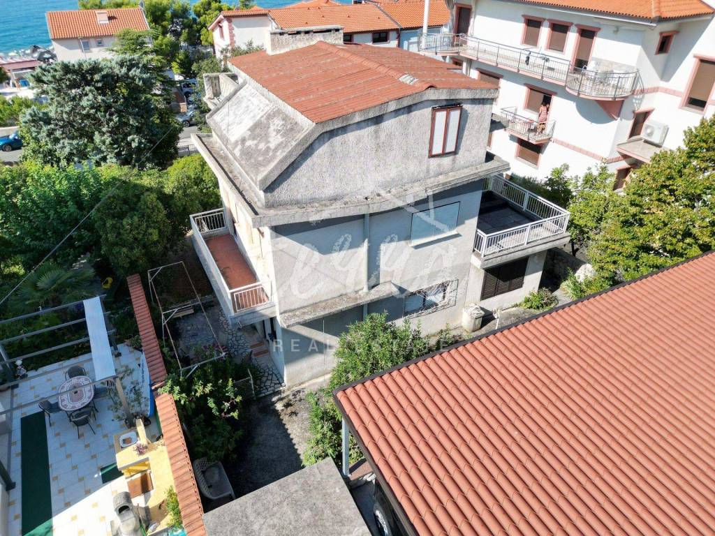 A spacious house with a net area of over 240 m² is for sale in an attractive location in Crikvenica, close to the sea and promenade. The house, situated in the second row from the sea, is on a 437 m² plot and consists of a basement, ground floor, first and second floors. The basement features a summer kitchen with a terrace. The ground floor, with two entrances, includes a living room with a fireplace, main bathroom, storage room, kitchen, bedroom with an additional bathroom, two hallways, and a terrace. The first floor has three bedrooms, one with a sea-view terrace, another with a small balcony, and the third with a balcony, along with a shared bathroom. The second floor, a raised attic, includes a small bedroom, a large semi-open space that can serve as a bedroom, living room, and a space planned for a kitchen, and a large terrace with a stunning sea view. The plot is fully fenced and provides parking for four cars within the yard.