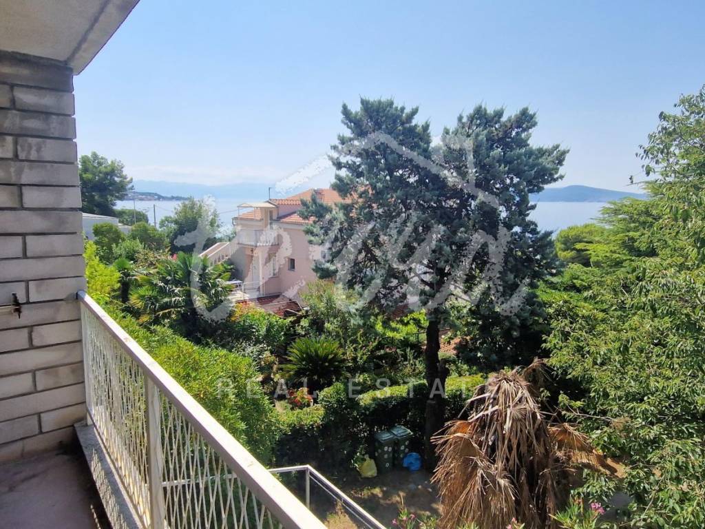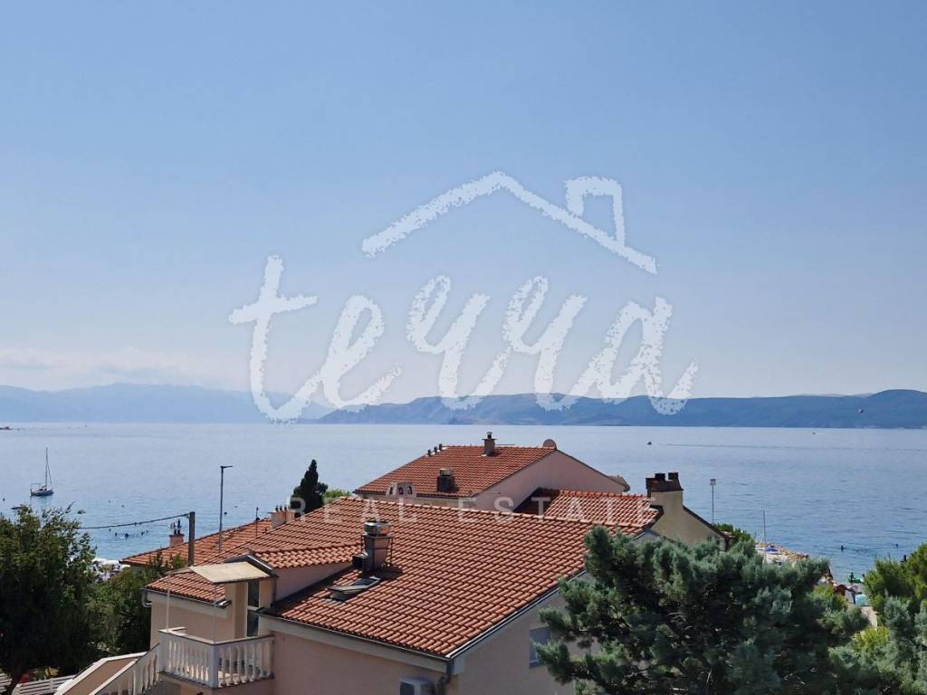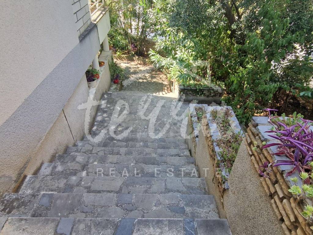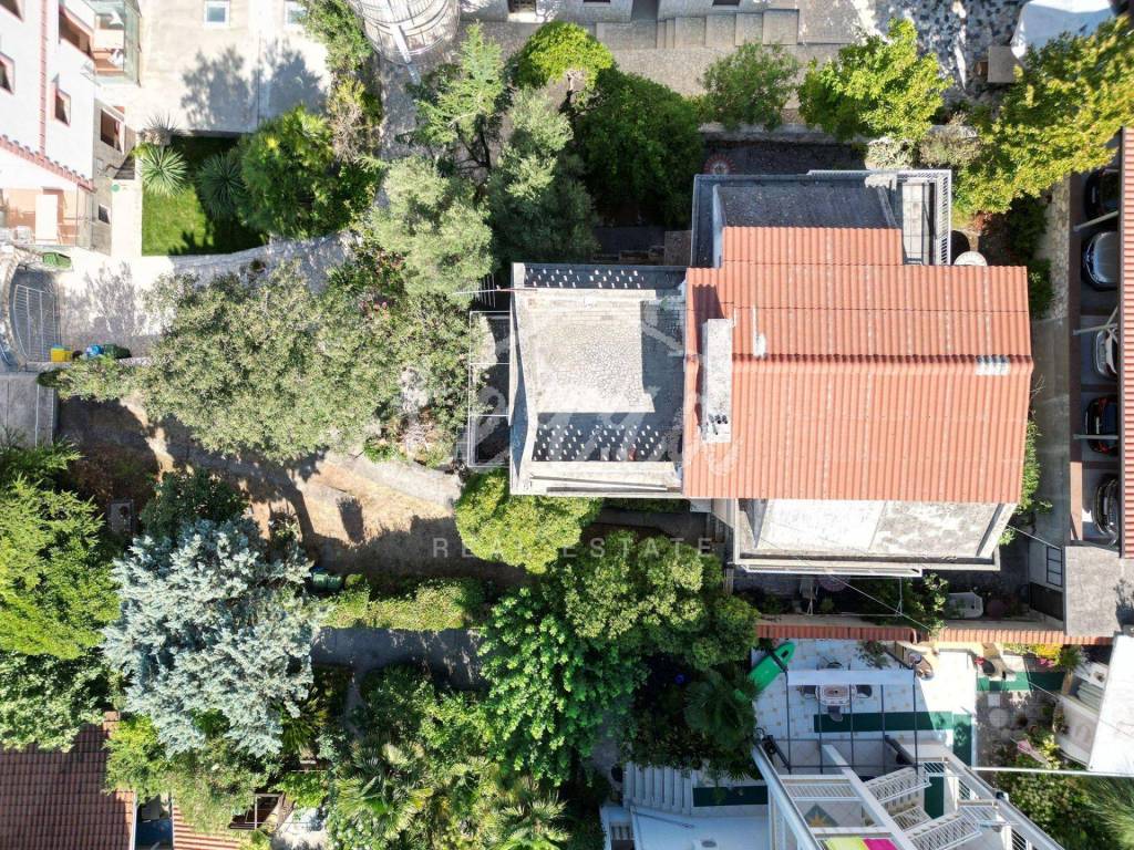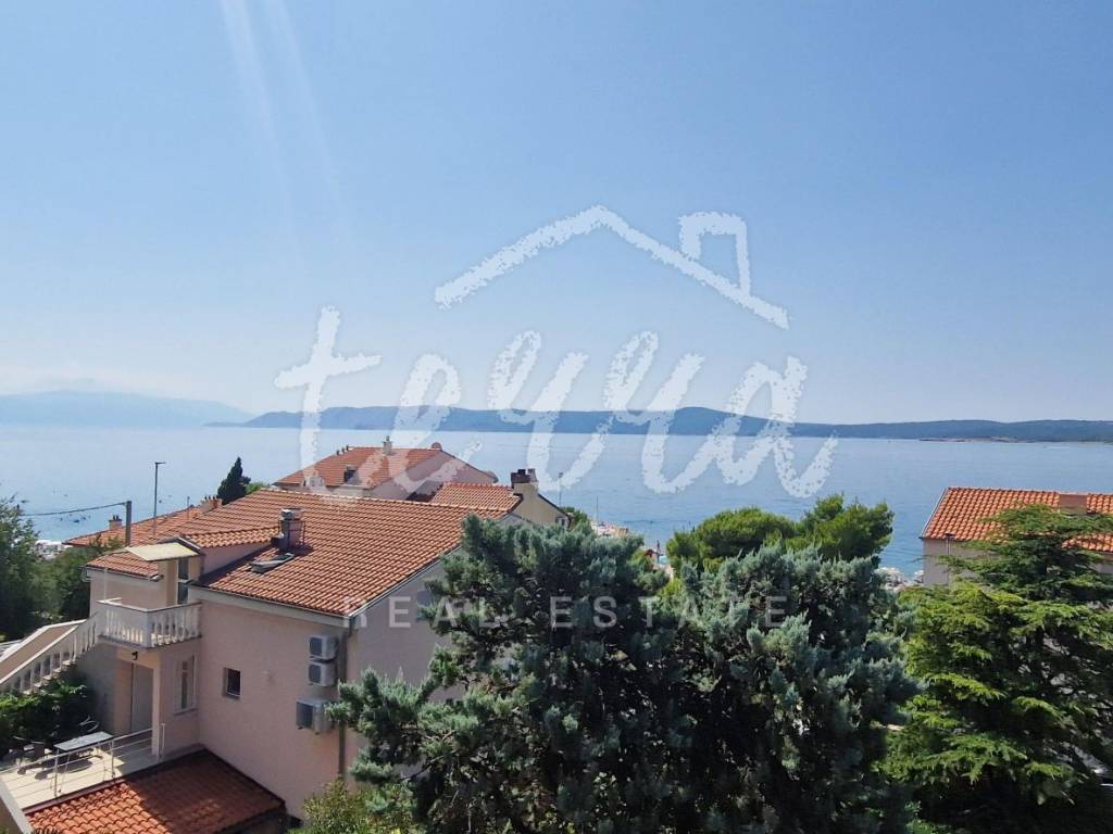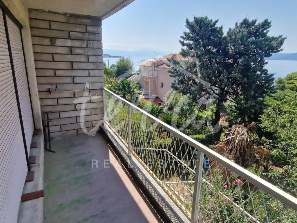 A spacious house with a net area of over 240 m² is for sale in an attractive location in Crikvenica, close to the sea and promenade. The house, situated in the second row from the sea, is on a 437 m² plot and consists of a basement, ground floor, first and second floors. The basement features a summer kitchen with a terrace. The ground floor, with two entrances, includes a living room with a fireplace, main bathroom, storage room, kitchen, bedroom with an additional bathroom, two hallways, and a terrace. The first floor has three bedrooms, one with a sea-view terrace, another with a small balcony, and the third with a balcony, along with a shared bathroom. The second floor, a raised attic, includes a small bedroom, a large semi-open space that can serve as a bedroom, living room, and a space planned for a kitchen, and a large terrace with a stunning sea view. The plot is fully fenced and provides parking for four cars within the yard.