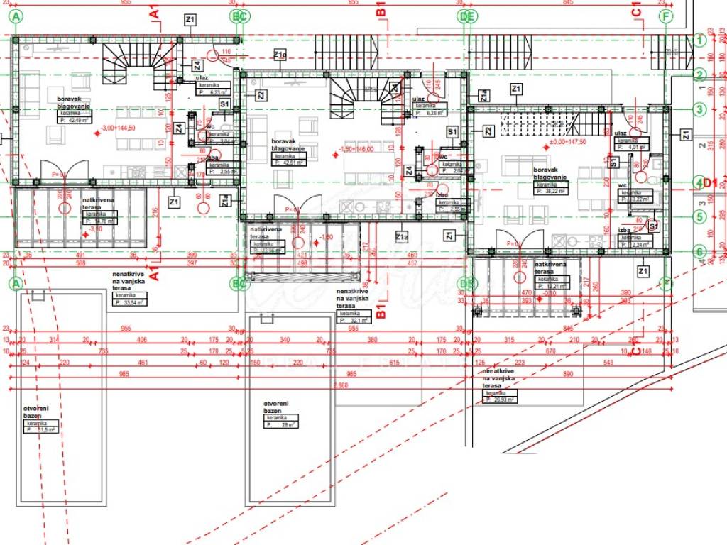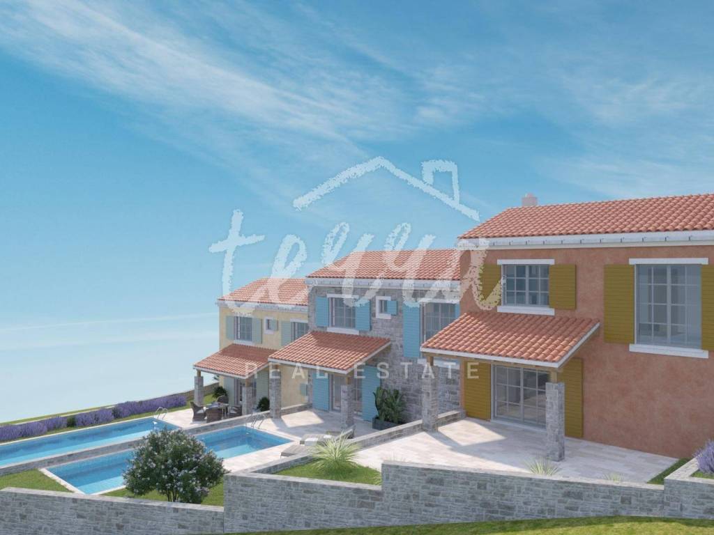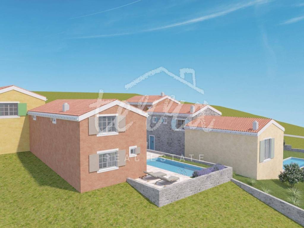 In the dominant location of Crikvenica, next to the green belt, single-family houses in Mediterranean style are for sale. On the larger plot, building plots have been created for 5 buildings, each with a garden and a swimming pool. The houses are two-storey apartments in the countryside, with the living room with kitchen and dining room on the first floor, all integrated into the outdoor space. On the second floor there are three bedrooms and two bathrooms. The expected completion of the works and occupation is in 2025, with the possibility of choosing materials for floor and wall coverings.