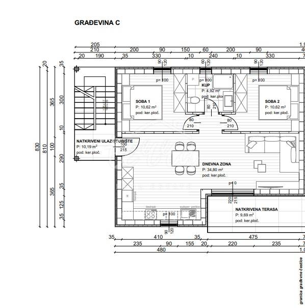 The apartment spans 80.84 m² and consists of two bedrooms, each 10.62 m², a living room with an area of 34.80 m², a bathroom (4.92 m²), and a terrace with a covered entrance.