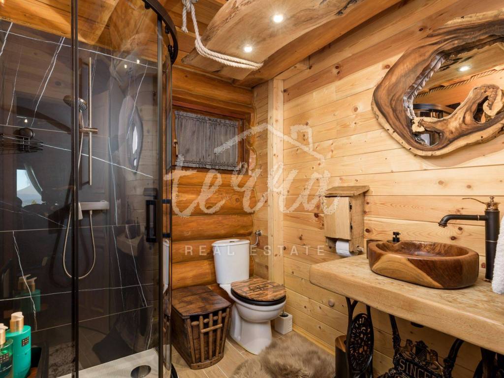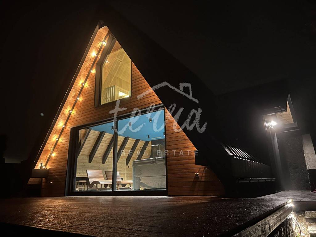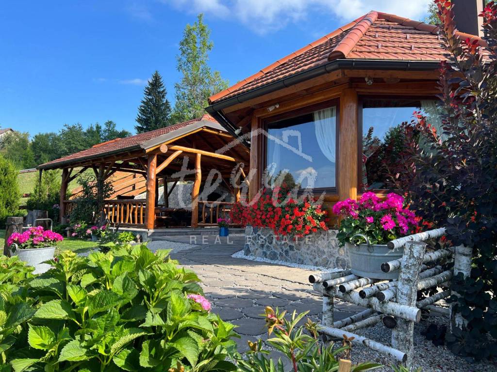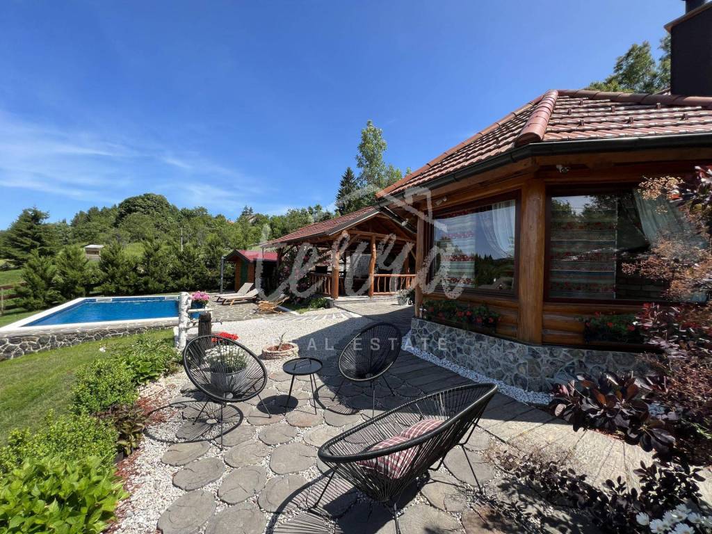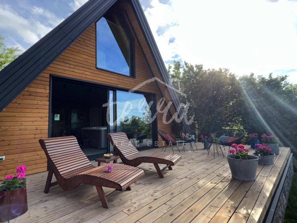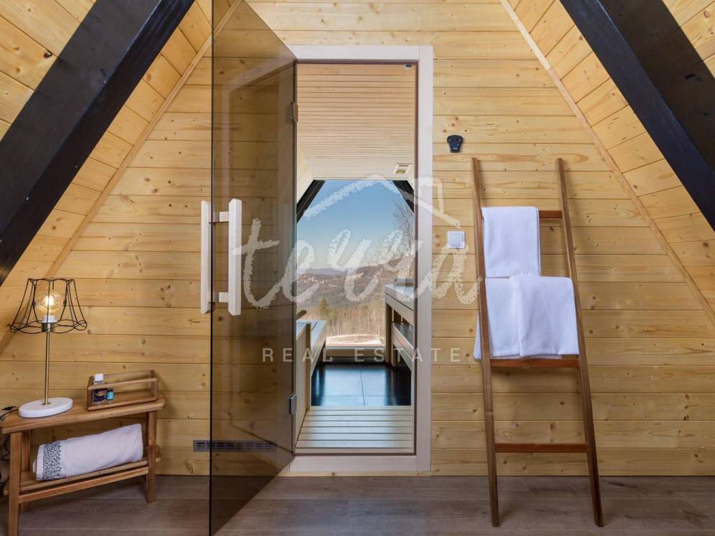 The main building is a wooden house, fully furnished and decorated with lots of taste and love. Next to the house is a large covered area for socializing with a grill, also built in the indigenous style. In front is a swimming pool with a sunbathing area. The second building, which is on a hill, is a wellness house with a jacuzzi with deck chairs and a shower, while on the first floor there is a sauna for 4 people. Everything is in glass because the view is spectacular.