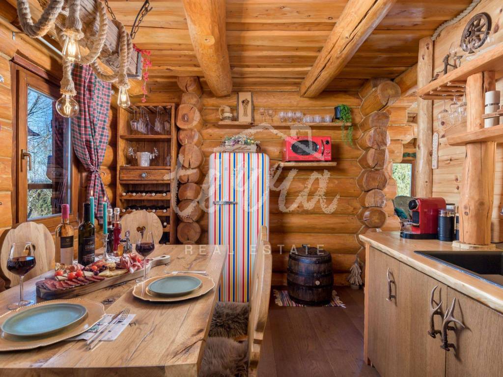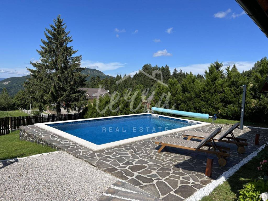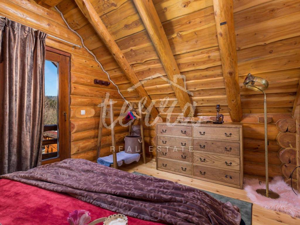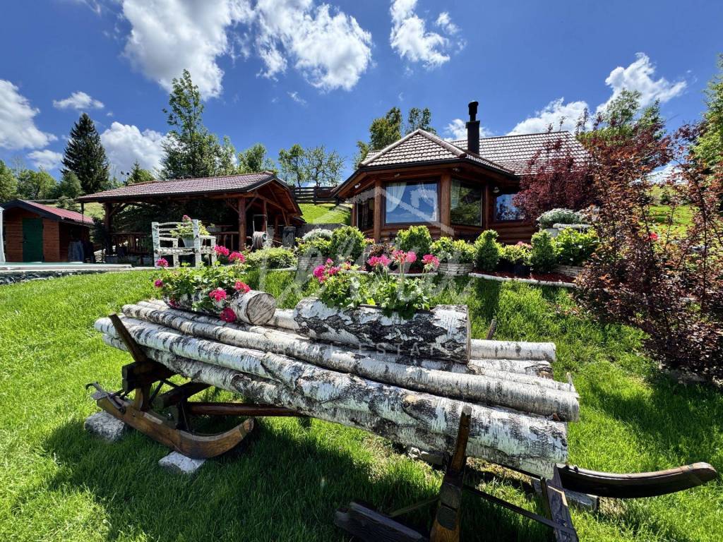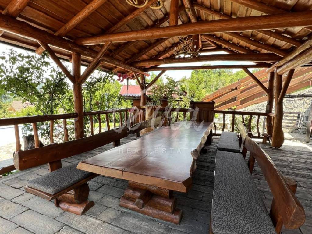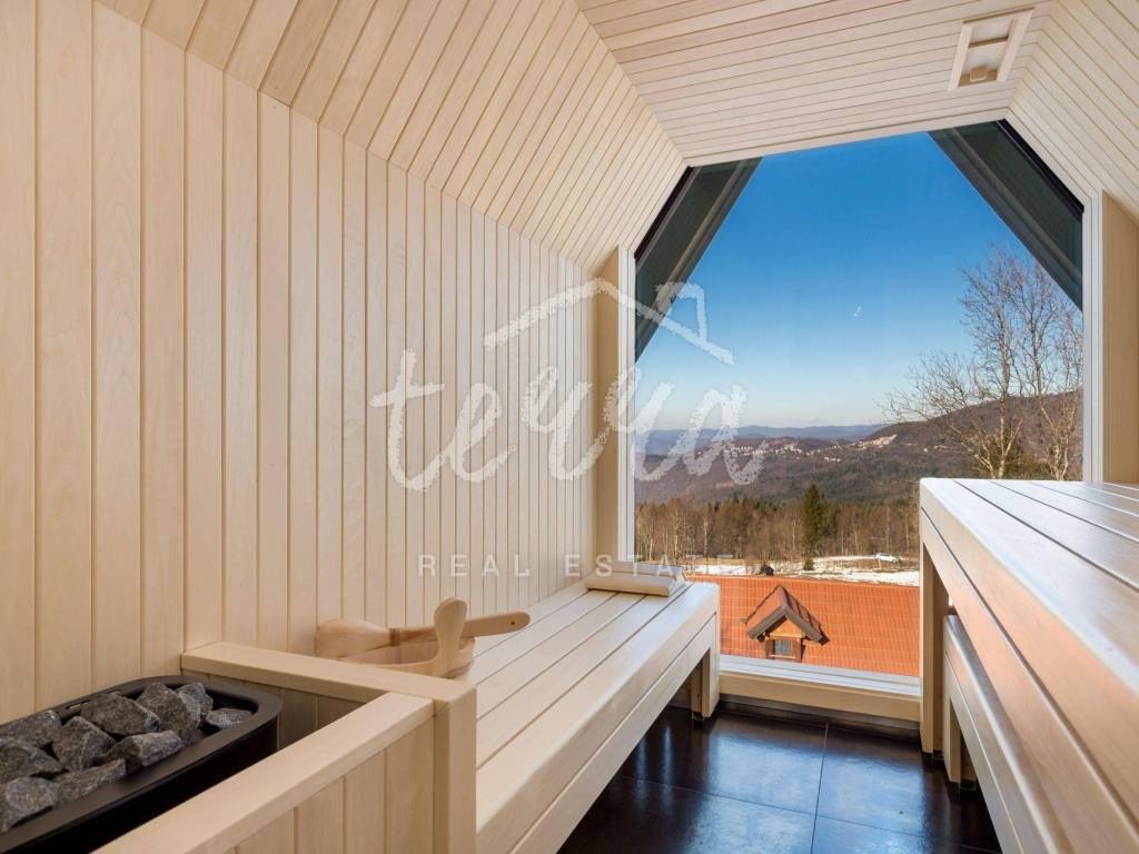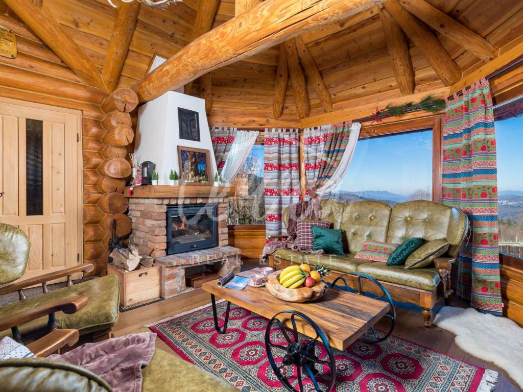 The main building is a wooden house, fully furnished and decorated with lots of taste and love. Next to the house is a large covered area for socializing with a grill, also built in the indigenous style. In front is a swimming pool with a sunbathing area. The second building, which is on a hill, is a wellness house with a jacuzzi with deck chairs and a shower, while on the first floor there is a sauna for 4 people. Everything is in glass because the view is spectacular.