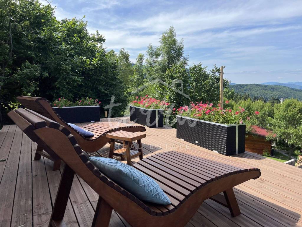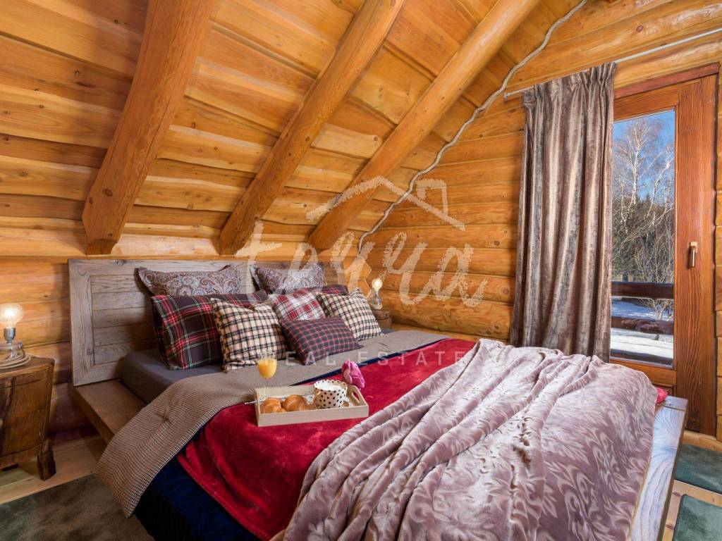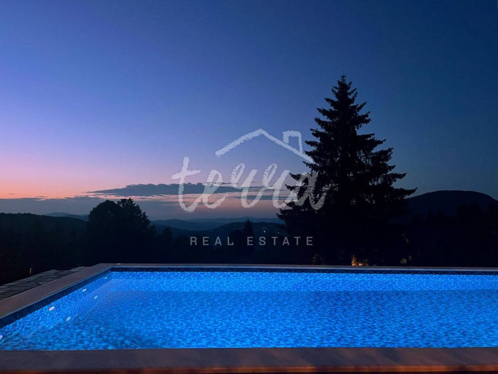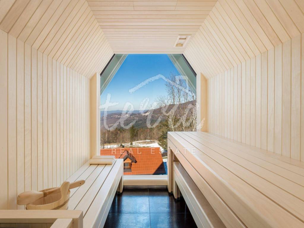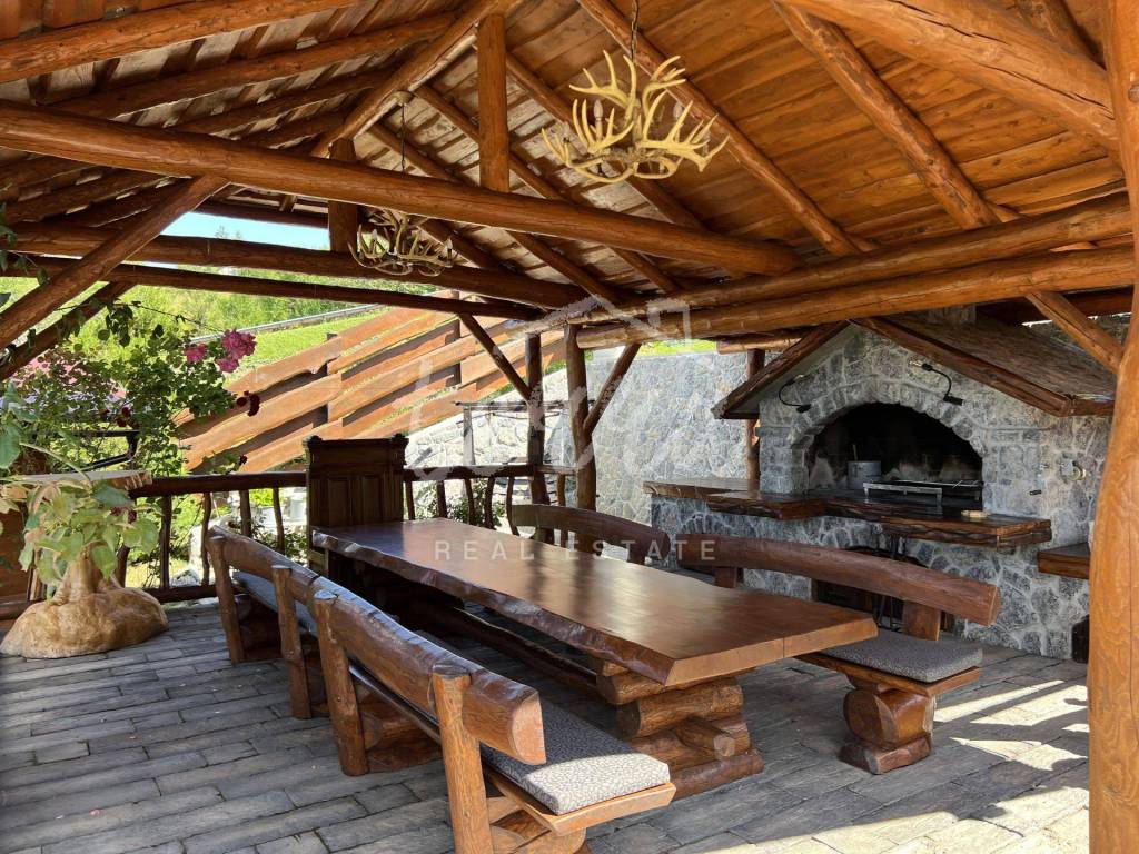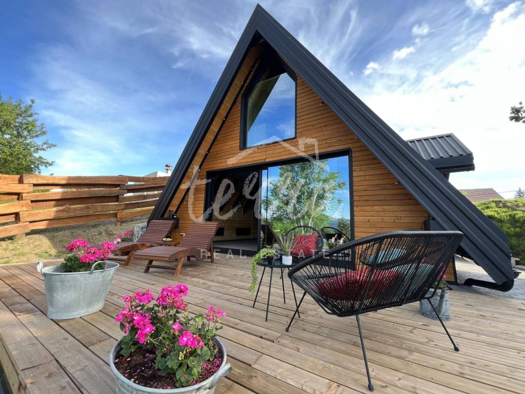 The main building is a wooden house, fully furnished and decorated with lots of taste and love. Next to the house is a large covered area for socializing with a grill, also built in the indigenous style. In front is a swimming pool with a sunbathing area. The second building, which is on a hill, is a wellness house with a jacuzzi with deck chairs and a shower, while on the first floor there is a sauna for 4 people. Everything is in glass because the view is spectacular.