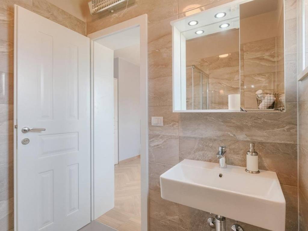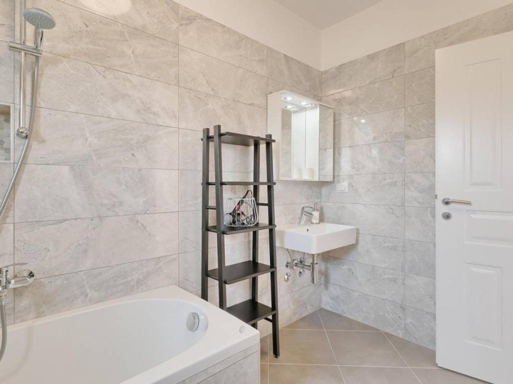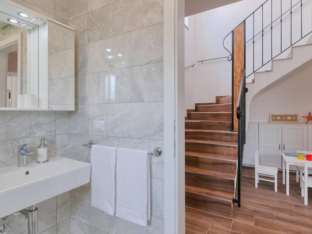 The ground floor of the house contains a living room with a kitchen and a dining room, one bedroom, a laundry room and a bathroom. An internal staircase leads to the first floor, where there are three bedrooms, one of which has its own bathroom, and a shared bathroom and terrace.