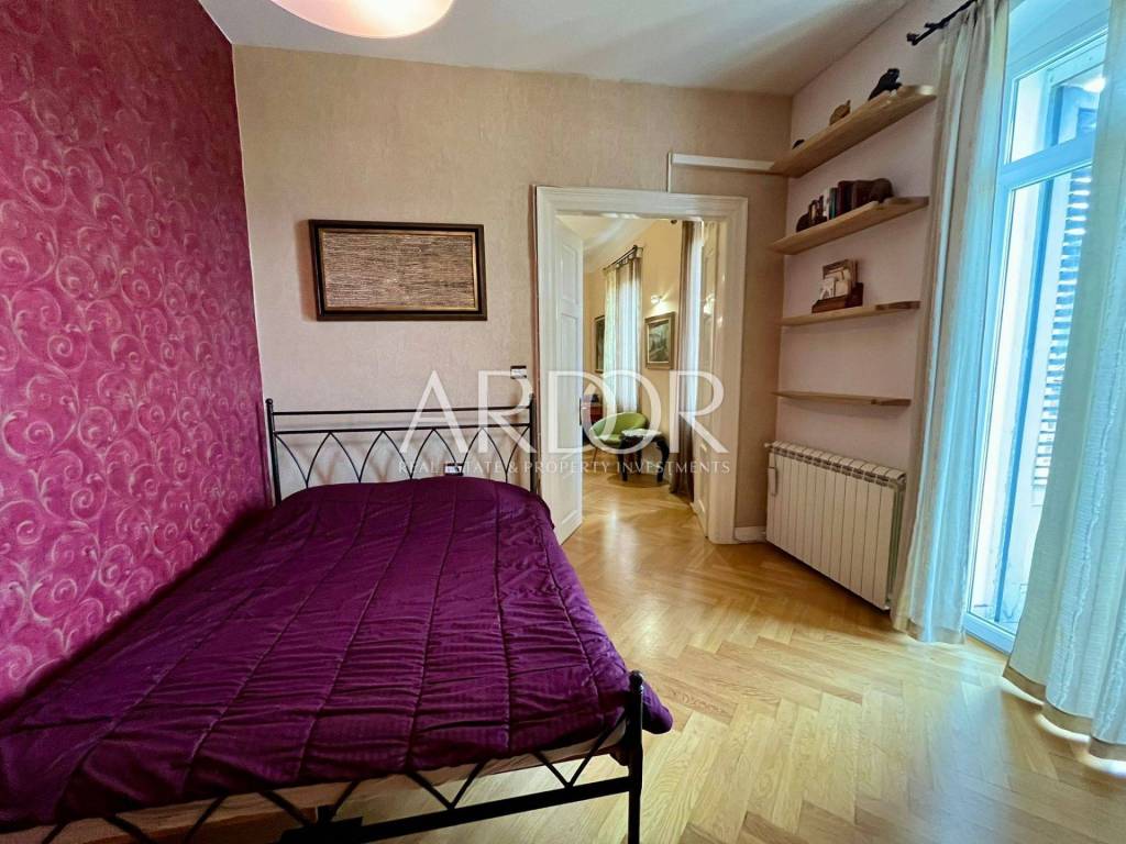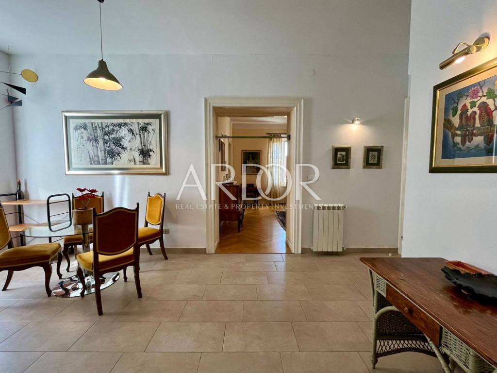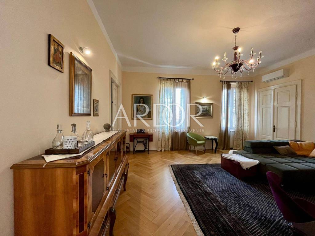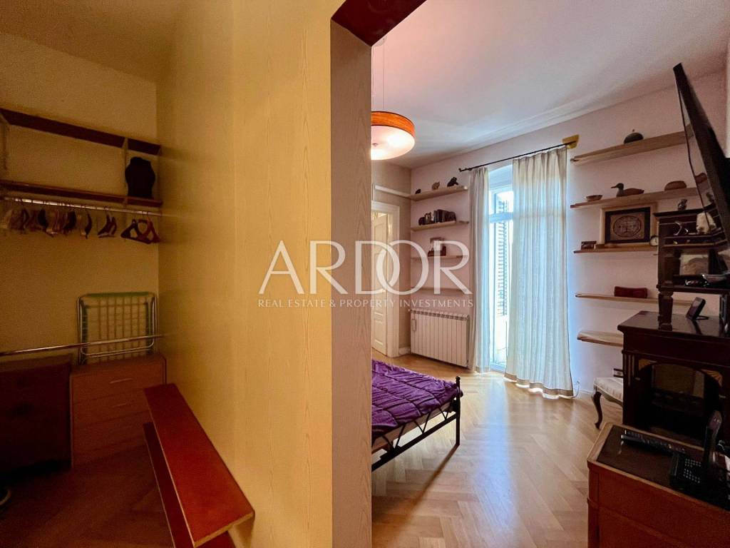 In a very frequent and practical location, a completely adapted and meticulously decorated gentleman's apartment with a total living area of 119.19 m2 on the 2nd floor of the building is for sale. The south-facing apartment consists of an entrance hall, two bathrooms and a separate toilet, three bedrooms, a kitchen with a dining area, and a spacious living room with access to a lovely balcony. A few years ago, it was completely renovated and a concrete mezzanine structure was poured, new oak parquet floors, underfloor heating in the bathroom, gas central heating, PVC windows and air conditioning. The building in which it is located is of very high quality construction. It is located just a few minutes from Rijeka's famous Korzo promenade. The apartment is divided into two residential units: a studio apartment with a bathroom and a two-room gentleman's apartment.