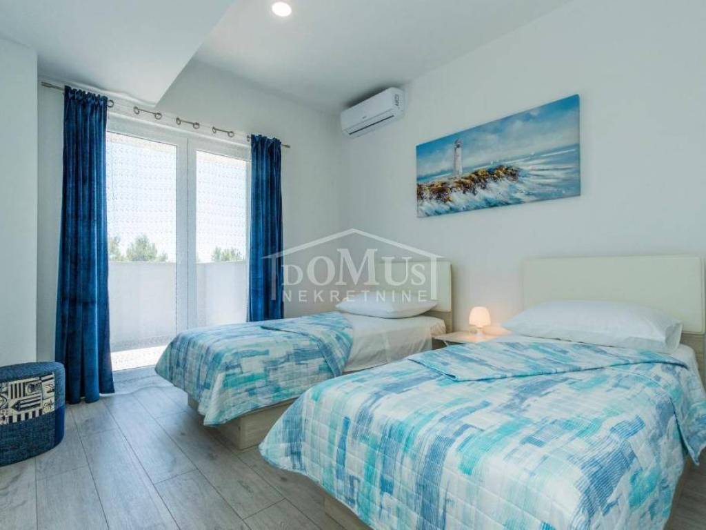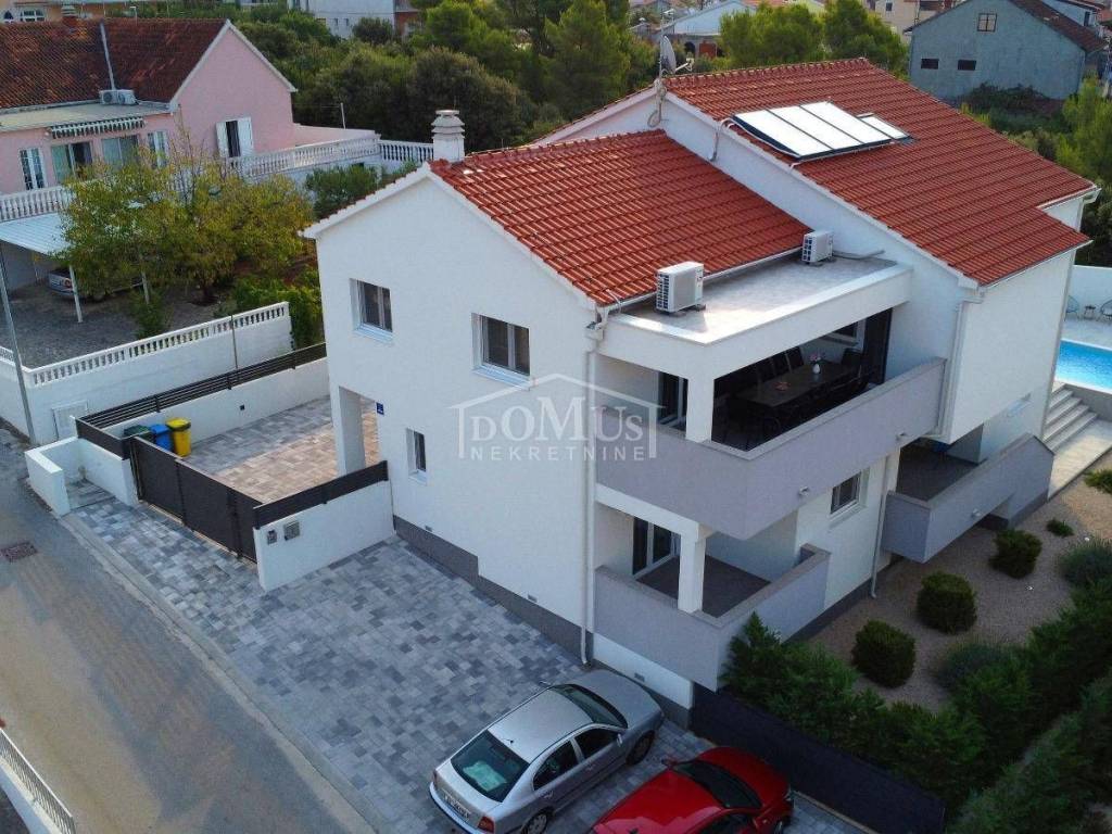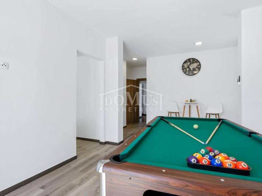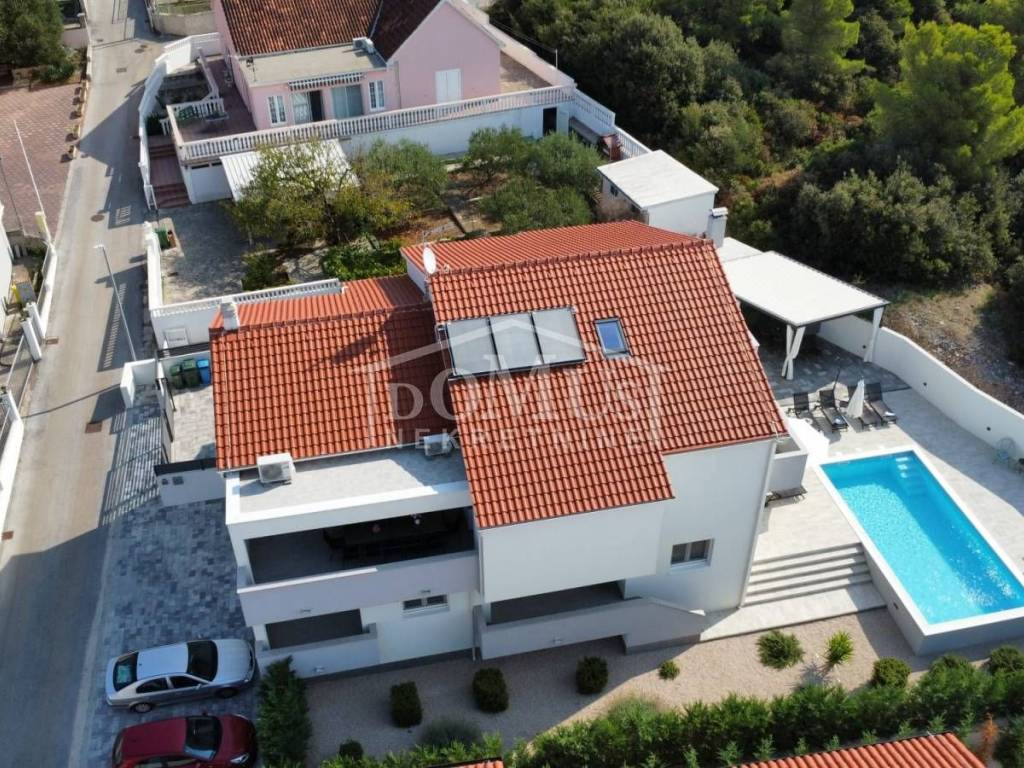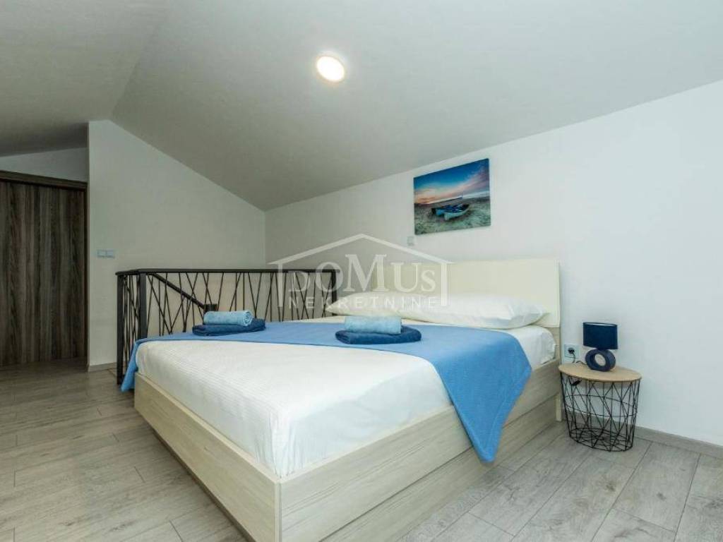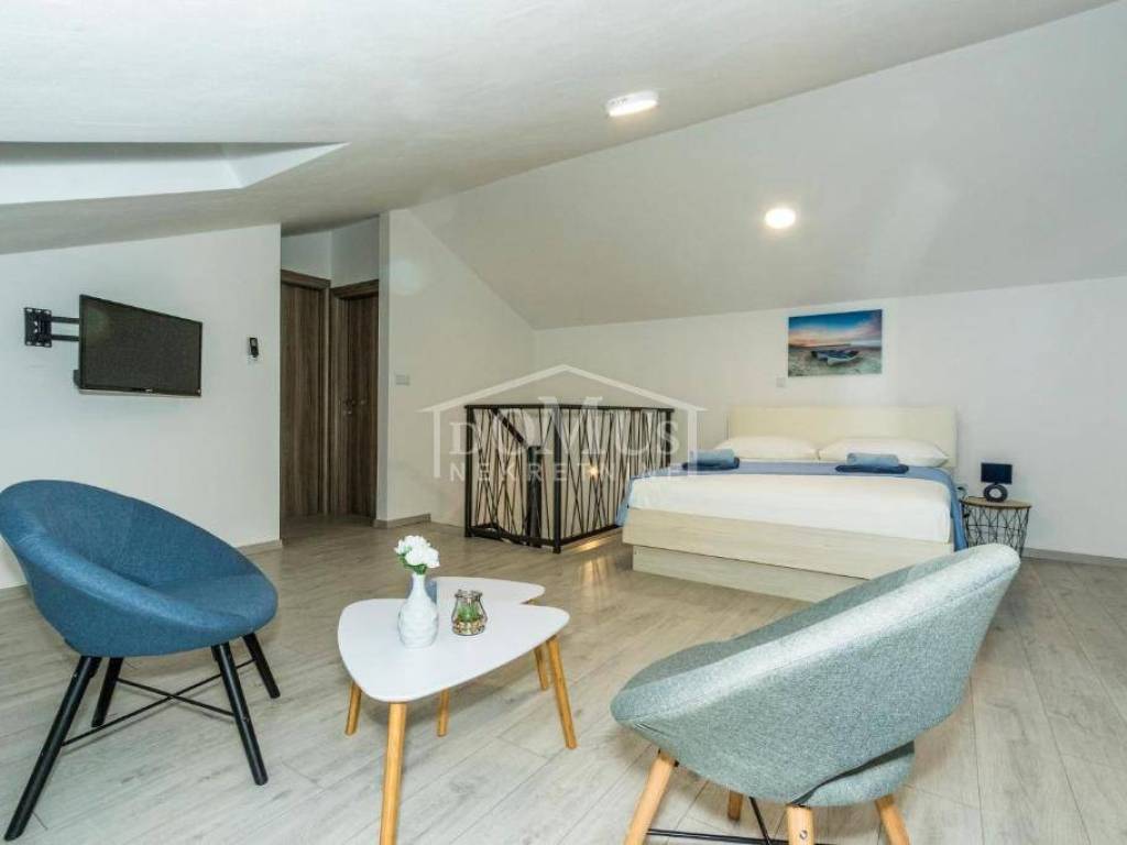 Attractive house with apartments, new building with sea view. The house is built on three floors with a total of 348.56 m2 of usable area on a plot of 734 m2, and consists of 5 separate residential units. On the ground floor there are 3 separate 1 / bedroom apartments and each of them consists of a bedroom, bathroom, living room with kitchen and exit to the terraces and garden. Internal stairs lead to the 1st floor which consists of 2 separate residential units and one 1-bedroom apartment (2 bedrooms, living room with kitchen and exit to the terrace and bathroom) and a large 3-bedroom duplex apartment consisting of hallway, living room living room with kitchen and exit to the terrace overlooking the sea, toilet, hallway, 2 bedrooms, bathroom, internal stairs lead to the gallery with a room, bathroom, and in the same gallery there is a storage room. On the ground floor, two apartments have been converted into hobby rooms - billiards and fitness (for rent - holiday home), and the remaining 3 accommodation units are equipped with furniture and can accommodate 12 people. The yard is fenced, swimming pool of 32m2 (heated), sun deck, and summer kitchen with covered terrace, parking for 6 cars. Distance to the beach and the center is 170 m.