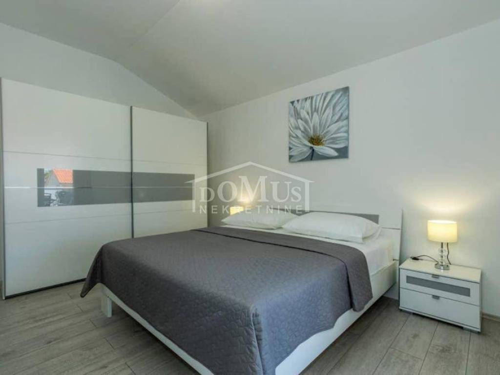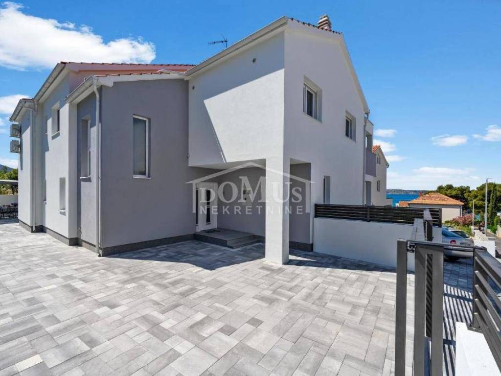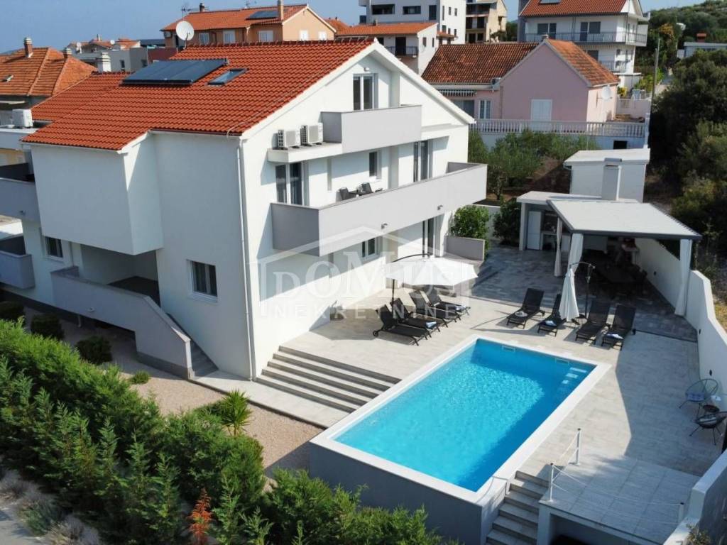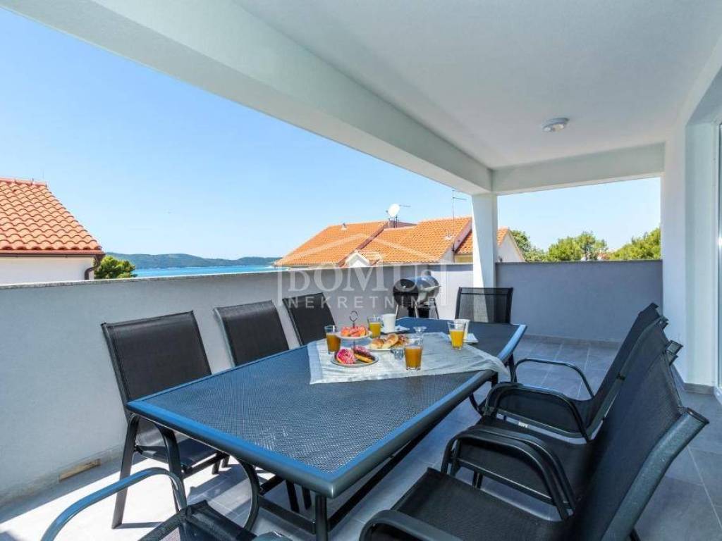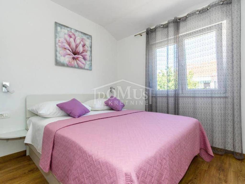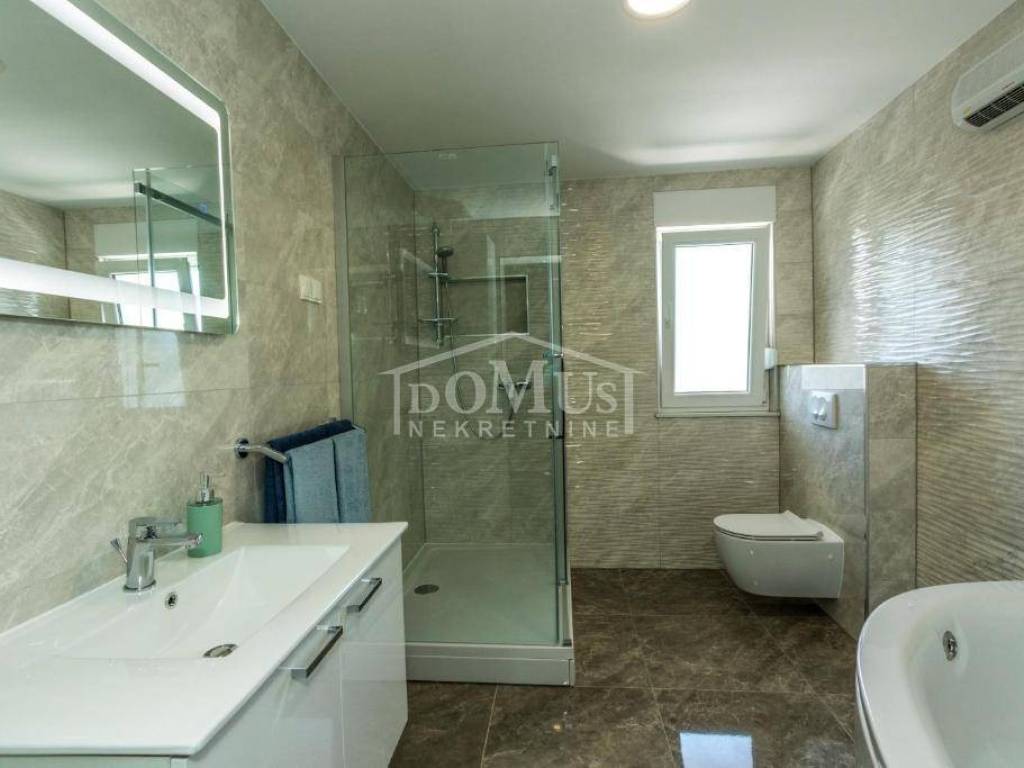Attractive house with apartments, new building with sea view. The house is built on three floors with a total of 348.56 m2 of usable area on a plot of 734 m2, and consists of 5 separate residential units. On the ground floor there are 3 separate 1 / bedroom apartments and each of them consists of a bedroom, bathroom, living room with kitchen and exit to the terraces and garden. Internal stairs lead to the 1st floor which consists of 2 separate residential units and one 1-bedroom apartment (2 bedrooms, living room with kitchen and exit to the terrace and bathroom) and a large 3-bedroom duplex apartment consisting of hallway, living room living room with kitchen and exit to the terrace overlooking the sea, toilet, hallway, 2 bedrooms, bathroom, internal stairs lead to the gallery with a room, bathroom, and in the same gallery there is a storage room. On the ground floor, two apartments have been converted into hobby rooms - billiards and fitness (for rent - holiday home), and the remaining 3 accommodation units are equipped with furniture and can accommodate 12 people. The yard is fenced, swimming pool of 32m2 (heated), sun deck, and summer kitchen with covered terrace, parking for 6 cars. Distance to the beach and the center is 170 m.