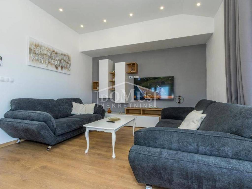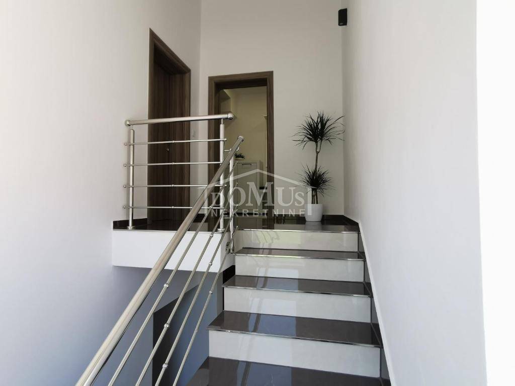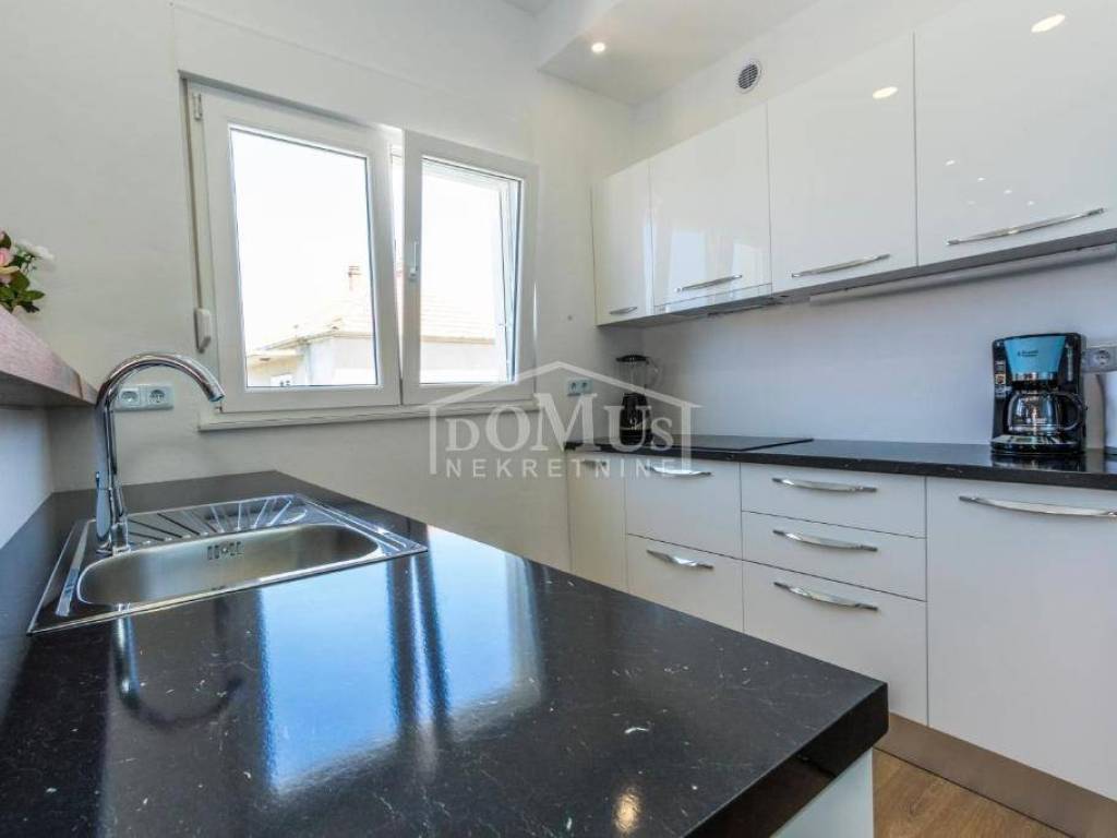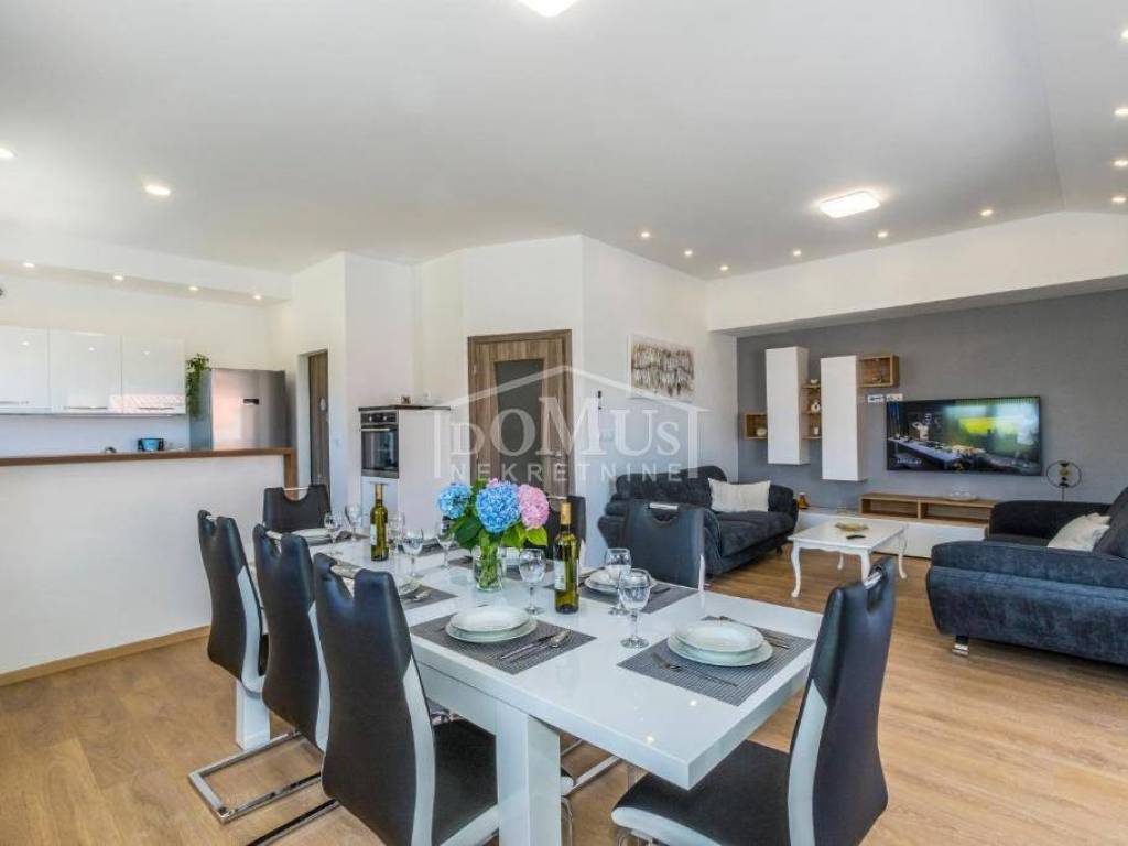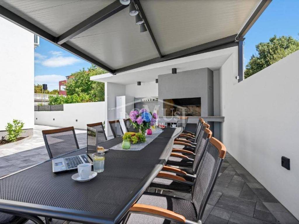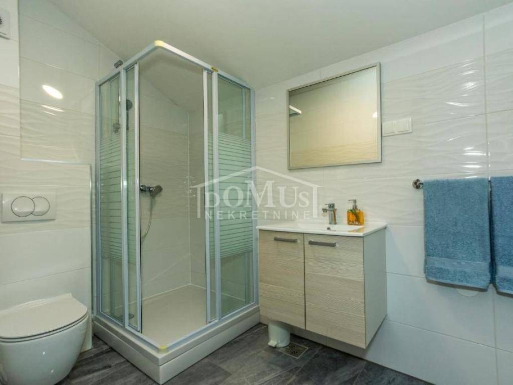 Attractive house with apartments, new building with sea view. The house is built on three floors with a total of 348.56 m2 of usable area on a plot of 734 m2, and consists of 5 separate residential units. On the ground floor there are 3 separate 1 / bedroom apartments and each of them consists of a bedroom, bathroom, living room with kitchen and exit to the terraces and garden. Internal stairs lead to the 1st floor which consists of 2 separate residential units and one 1-bedroom apartment (2 bedrooms, living room with kitchen and exit to the terrace and bathroom) and a large 3-bedroom duplex apartment consisting of hallway, living room living room with kitchen and exit to the terrace overlooking the sea, toilet, hallway, 2 bedrooms, bathroom, internal stairs lead to the gallery with a room, bathroom, and in the same gallery there is a storage room. On the ground floor, two apartments have been converted into hobby rooms - billiards and fitness (for rent - holiday home), and the remaining 3 accommodation units are equipped with furniture and can accommodate 12 people. The yard is fenced, swimming pool of 32m2 (heated), sun deck, and summer kitchen with covered terrace, parking for 6 cars. Distance to the beach and the center is 170 m.