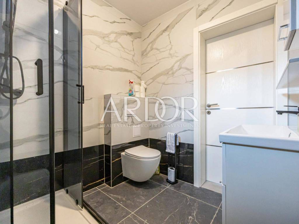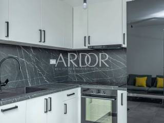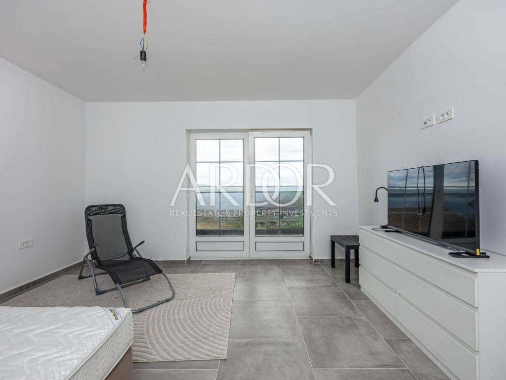 The apartment consists of a hallway, two bedrooms, an open-plan living room connected to a modern kitchen and dining area, and a fully renovated bathroom with a shower. There is also a loggia and a covered balcony with an impressive view of the sea and sunsets.